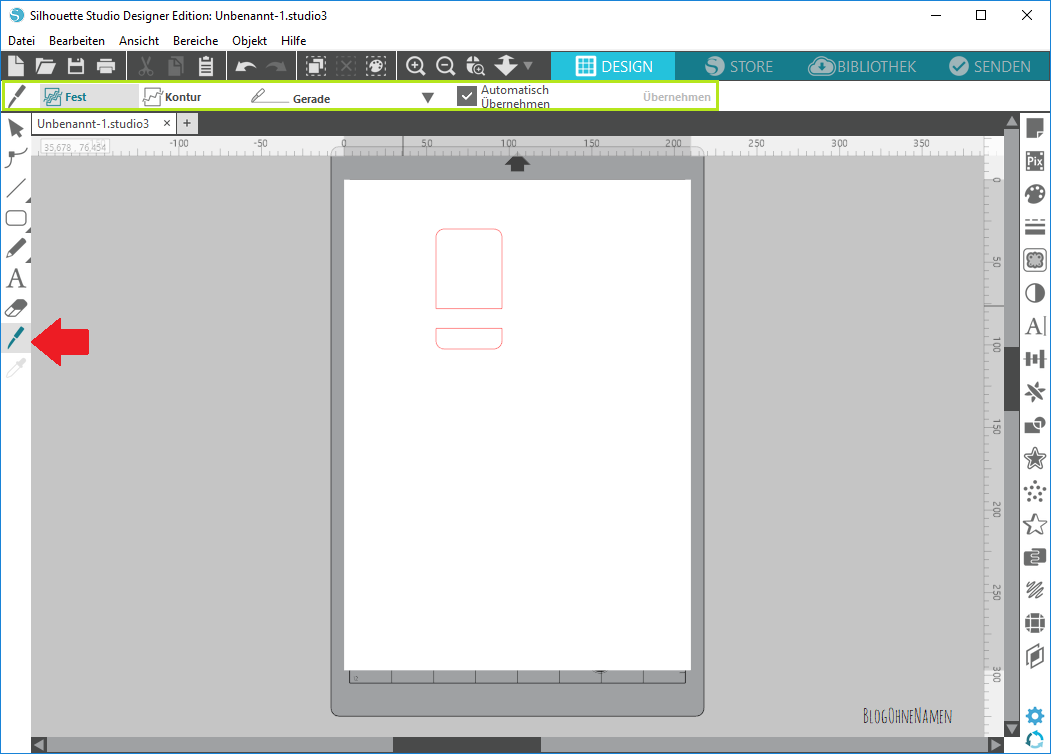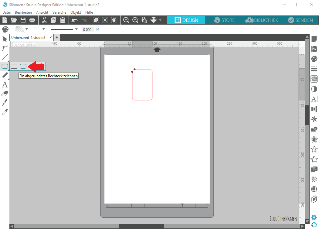 Öffnet anschließend die Silhouette Software und zeichnet mit der Funktion „abgerundetes Rechteck“ ein Rechteck. Wer mag, der kann das ganze natürlich auch mit einem ganz normalen machen. Allerdings besteht da immer die Gefahr, dass die Ecken schnell „angeschlagen“ aussehen,wenn die Labels eine Weile in Gebrauch gewesen sind.