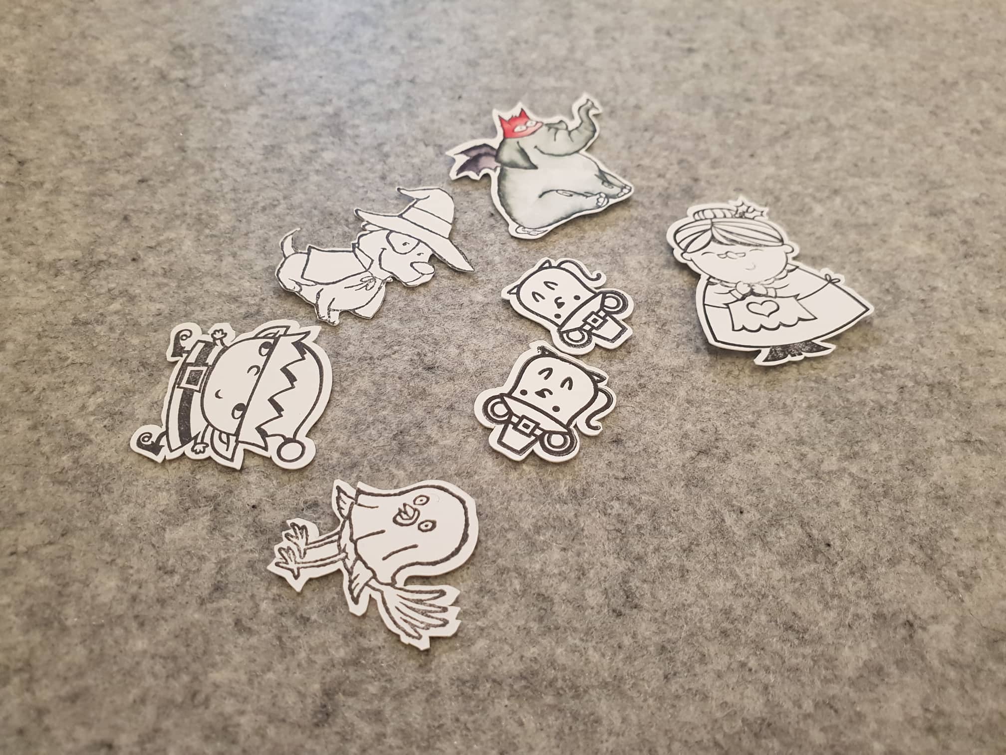 Mein erster Versuch mit diesen Materialien bezog sich auf das Schneiden von Stempelabdrücken. Hierfür wurden die Motive mit schwarzer Tinte auf ein Aquarellpapier gestempelt und anschließend über dem Menüpunkt „Direktschnitt“ und der Scan-Funktion in das Gerät übertragen. Das Festlegen der Schnittlinien und des Umrissabstandes (hiermit wird die „breite“ des weißen Randes bestimmt) hat gut funktioniert. Besonders hilfreich ist hier die Funktion „Glättung“, mit der man bestimmen kann, wie gut sich die Schnittlinie dem „Motiv“ anpasst.