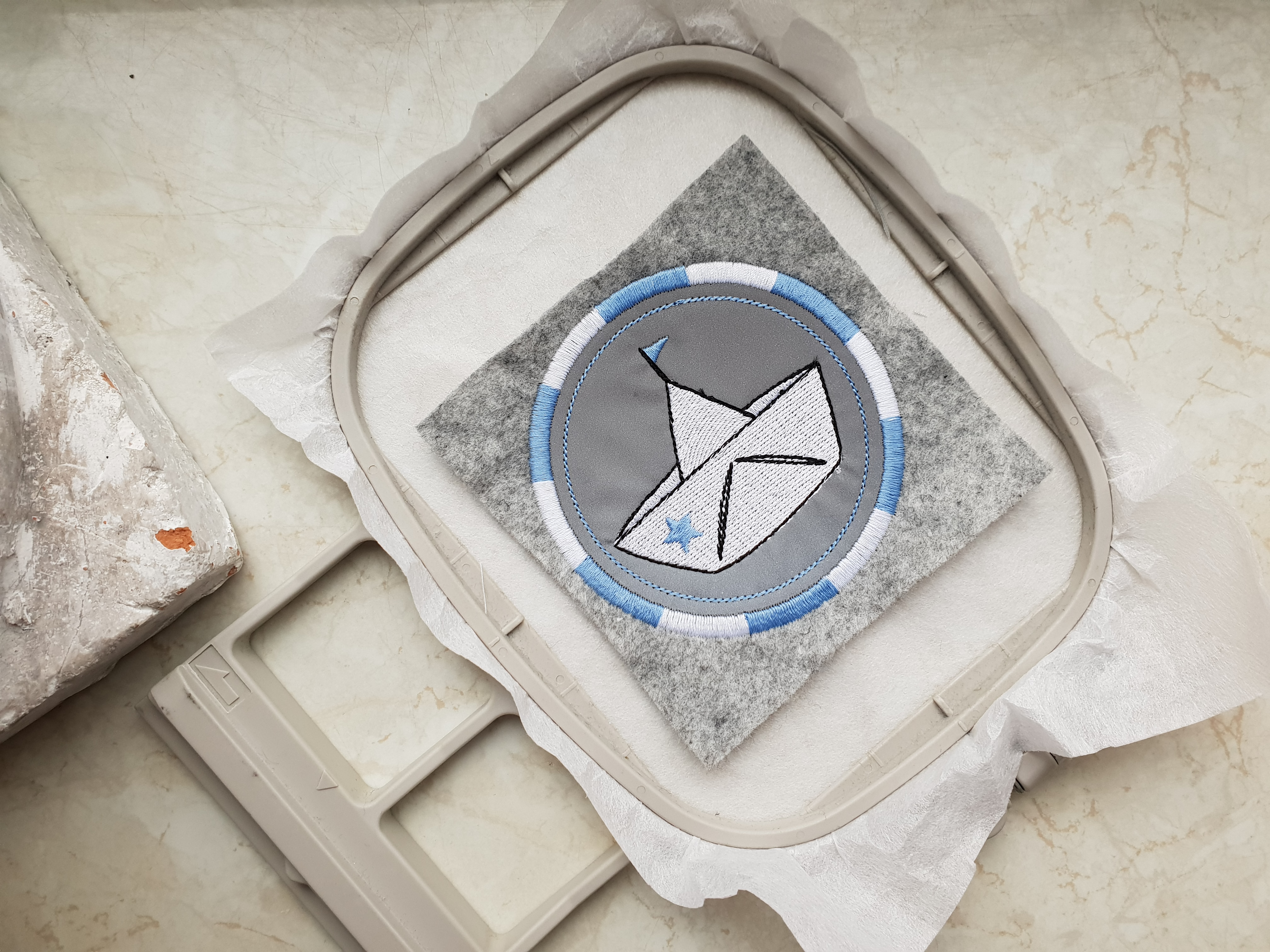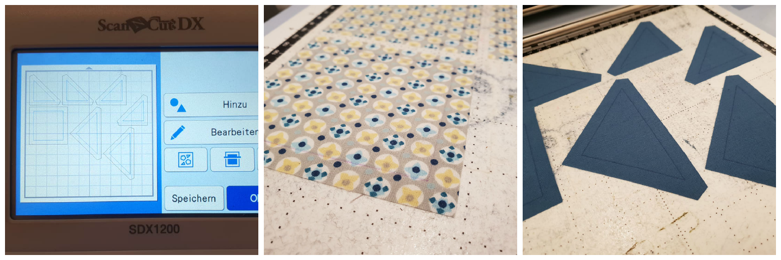 Verwendet hatte ich einen unifarbenen und einen gemusterten Stoff. Besonders praktisch war, dass man z.B. alle Elemente, die „Blau“ werden sollen auf den Schnittbereich legen kann und diese automatisch passend angeordnet werden. So erspart man sich die Zeit um die einzelnen Teile zu ordnen. Wenn der Platz für das zuschneiden nicht ausreichend ist, dann wird man von dem Gerät darüber informiert – und auch, wie viele Teile noch in den Schnittbereich passen. Zudem waren alle Teile bereits mit einer Nahtzugabe (1cm) versehen.