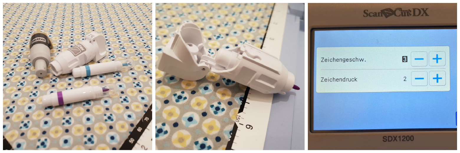 Das Arbeiten mit den Textilstiften hat wunderbar funktioniert. Anhand der beiliegenden Informationen kann man den entsprechenden Stift für sein Projekt auswählen. Dieser lässt sich ganz einfach in den Stifthalter und anschließend in das Gerät einsetzen. Je nach Geschmack lässt sich der „Zeichendruck“ noch einstellen. Hierbei sollte einem aber klar sein, dass bei einem erhöhten Druck mehr „Farbe“ des Stiftes in den Stoff einziehen kann. Dementsprechend kann es u.U. etwas länger dauern, bis die Farbe wieder verblasst.