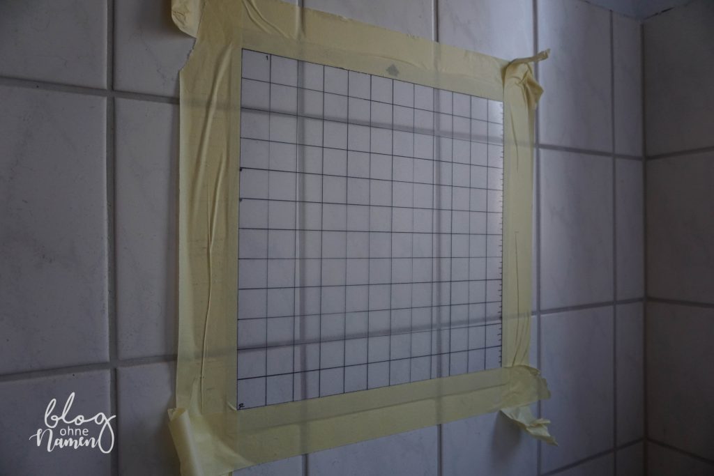 Bei mir wird – Ihr kennt das ja schon – die Matte dann im Badezimmer an die Fliesenwand geklebt und mit dem Sprühkleber besprüht. Für mich der perfekte Ort, denn hier kann ich direkt am geöffneten Fenster stehen, unser Zwerg kann nicht an die Matte und die Fliesen können danach ganz einfach (notfalls mit ein bisschen Kleberentferner) abgewischt  werden.