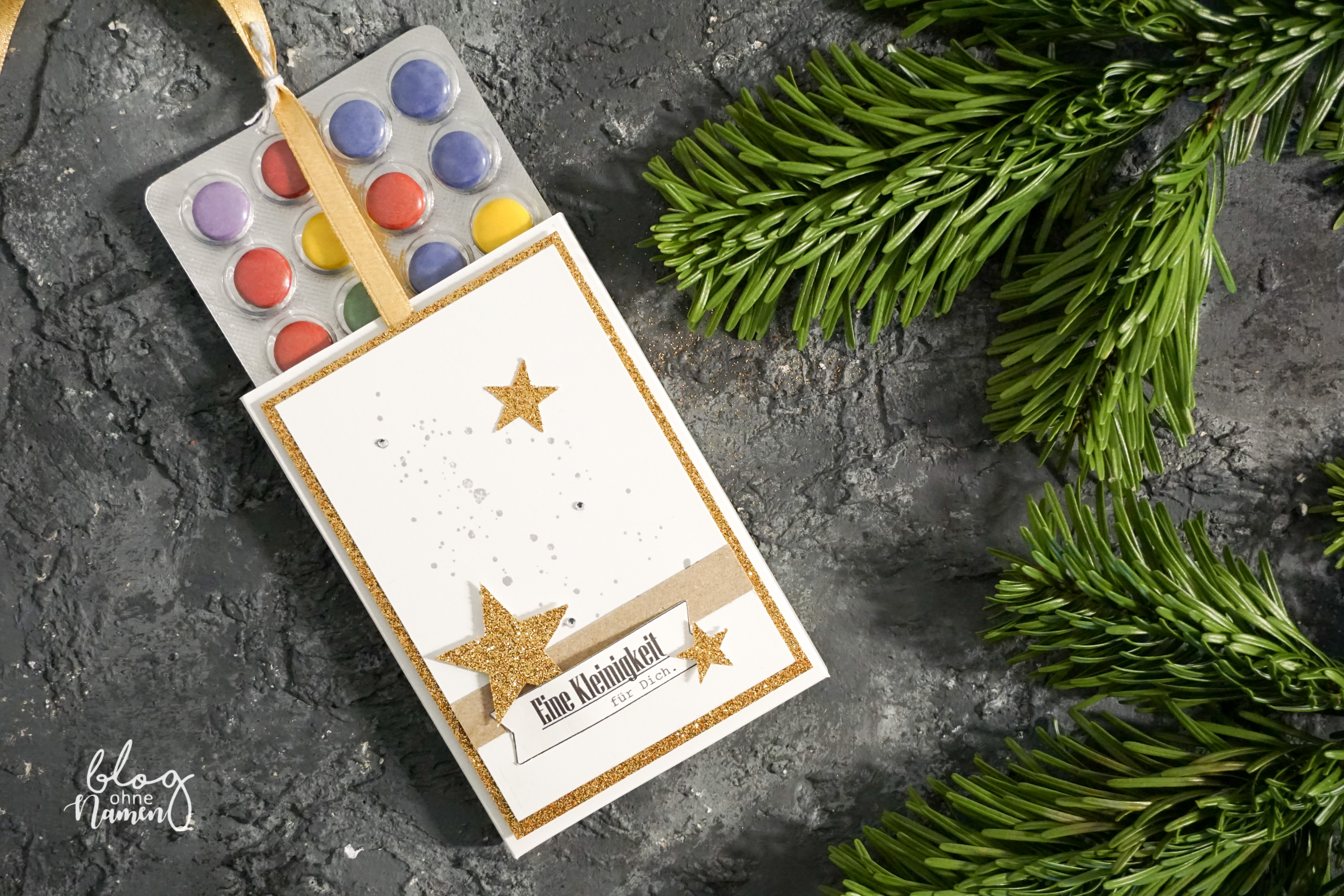 Das Seidenband sorgt zum einen dafür, dass der Inhalt fest in der Verpackung bleibt und beim herausziehen nicht herausrutscht. Zum anderen ist es ein kleiner Hingucker, der die Leute zum ausprobieren einlädt. Um zu verhindern, dass das Band aufgeht, habe ich es mit einer Kordel verknotet. So richtig glücklich macht mich diese Lösung nicht – da müsste man noch dran feilen. Vielleicht habt Ihr ja eine Idee, wie man das „schöner“ lösen kann?