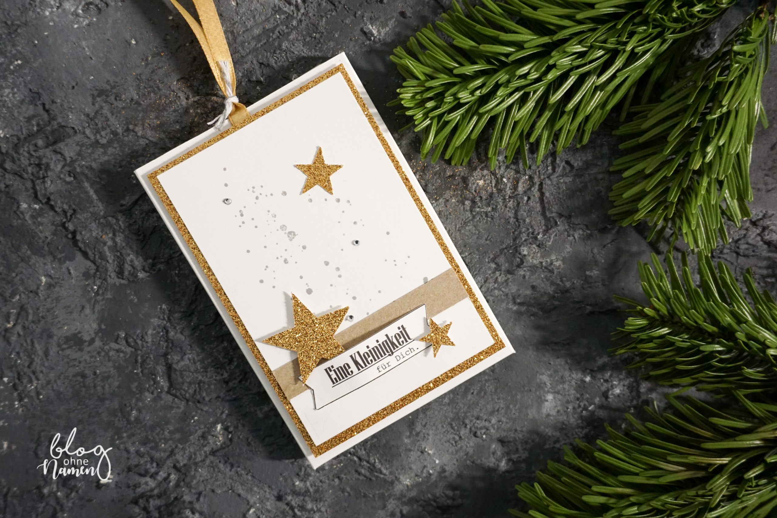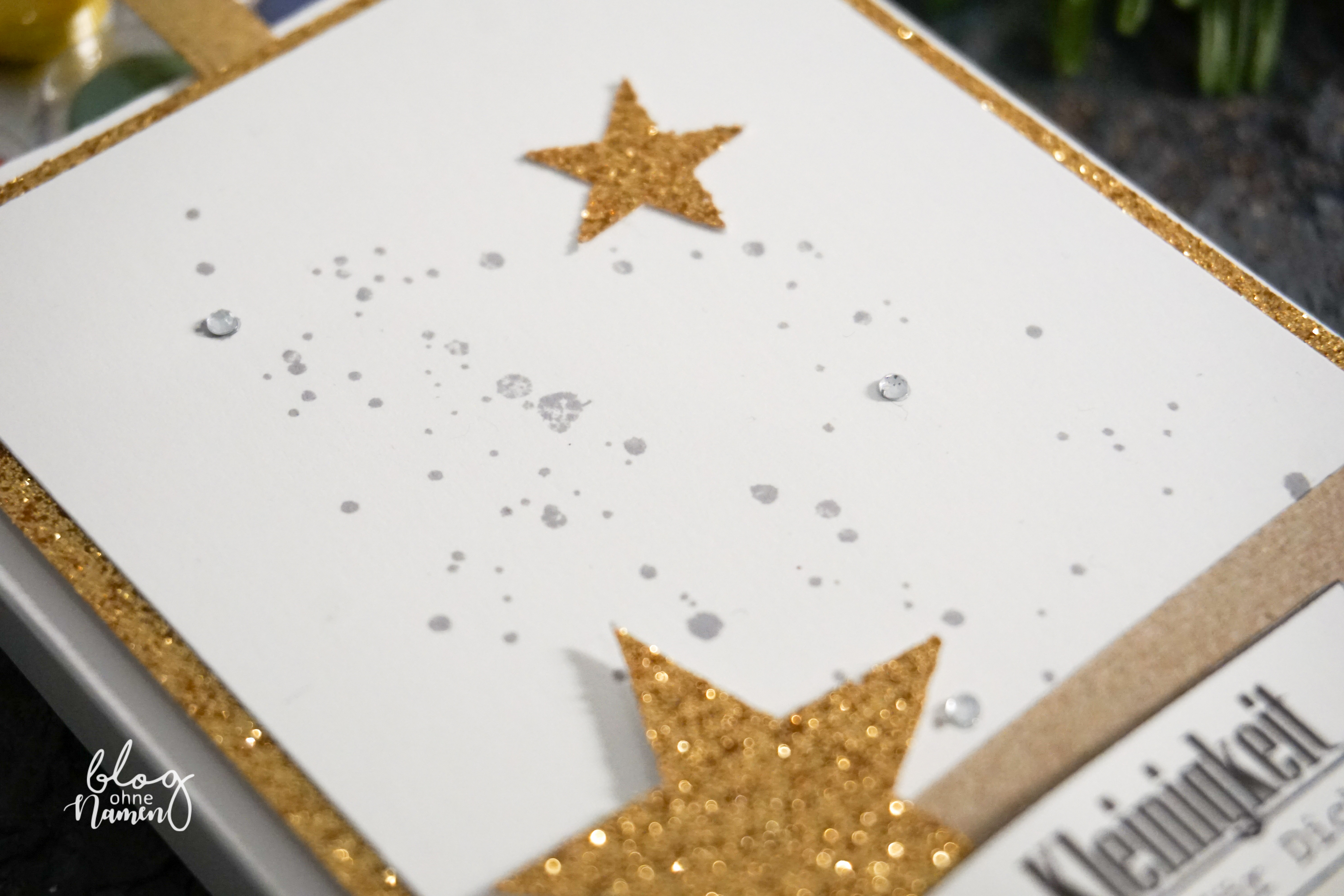 Bei der Gestaltung habe ich, wie bei meiner vorherigen Verpackung, auf weißes und goldglitzerndes Papier zurückgegriffen. Mir gefällt diese Kombination sehr gut, weil sie schlicht und trotzdem sehr edel aussieht. Für den Hintergrund habe ich einen Stempel aus dem Set „Gorgeous Grunge“ in grau aufgestempelt und mit einigen Strasssteinen versehen.  Die Sterne und der Streifen aus naturfarbenen Karton sollen das Ganze ein bisschen auflockern.