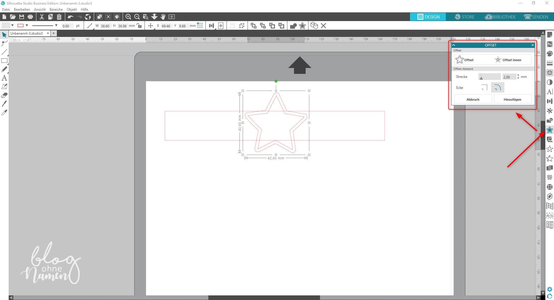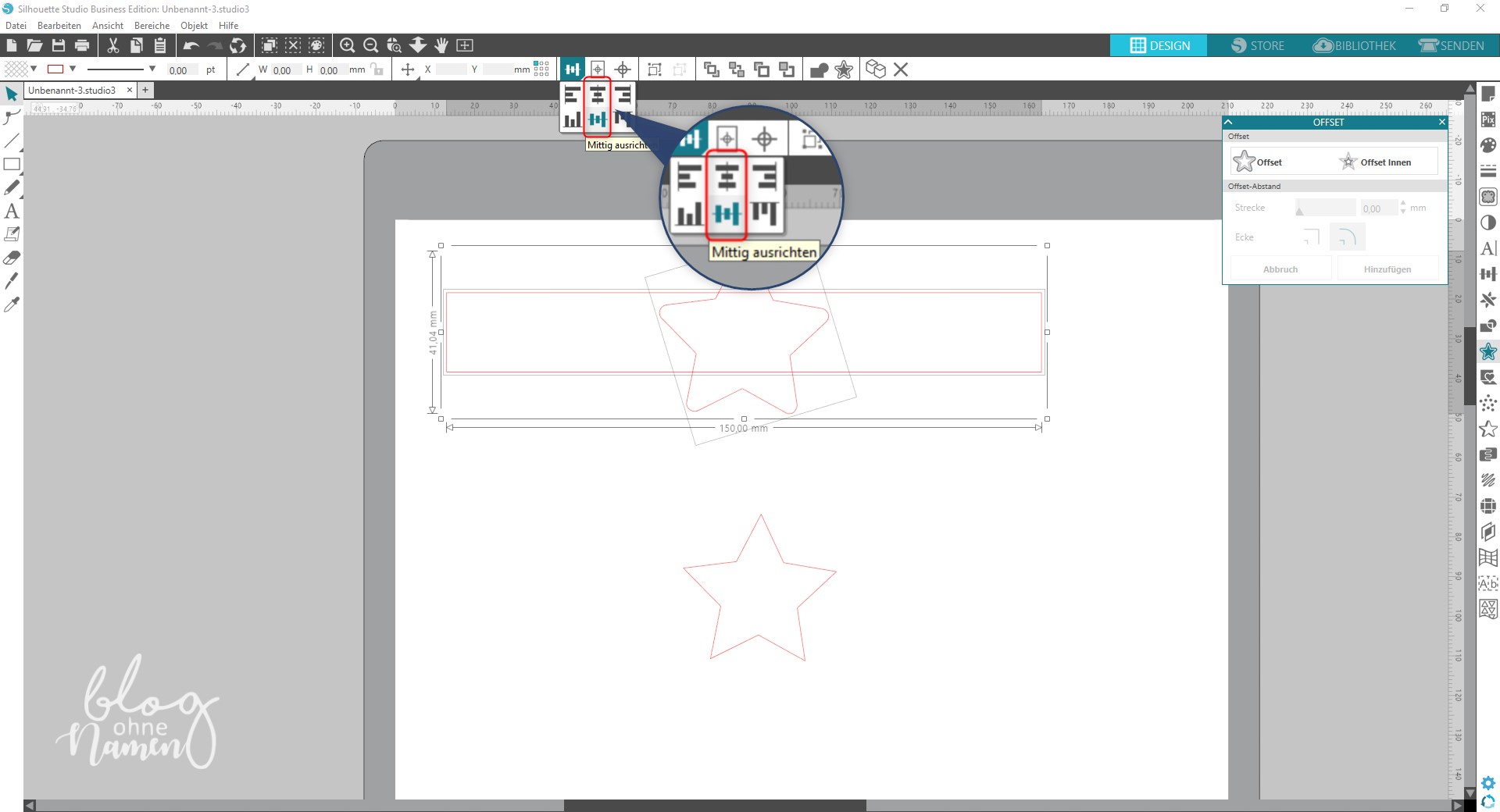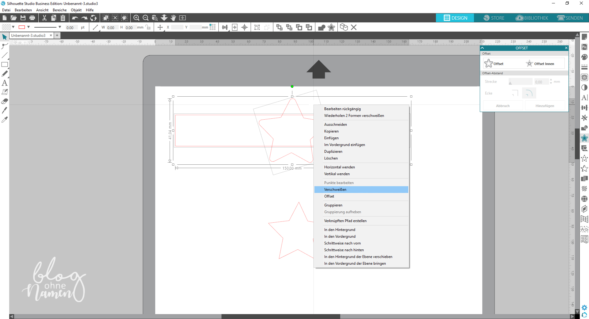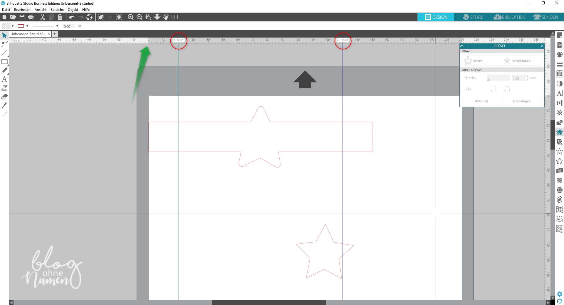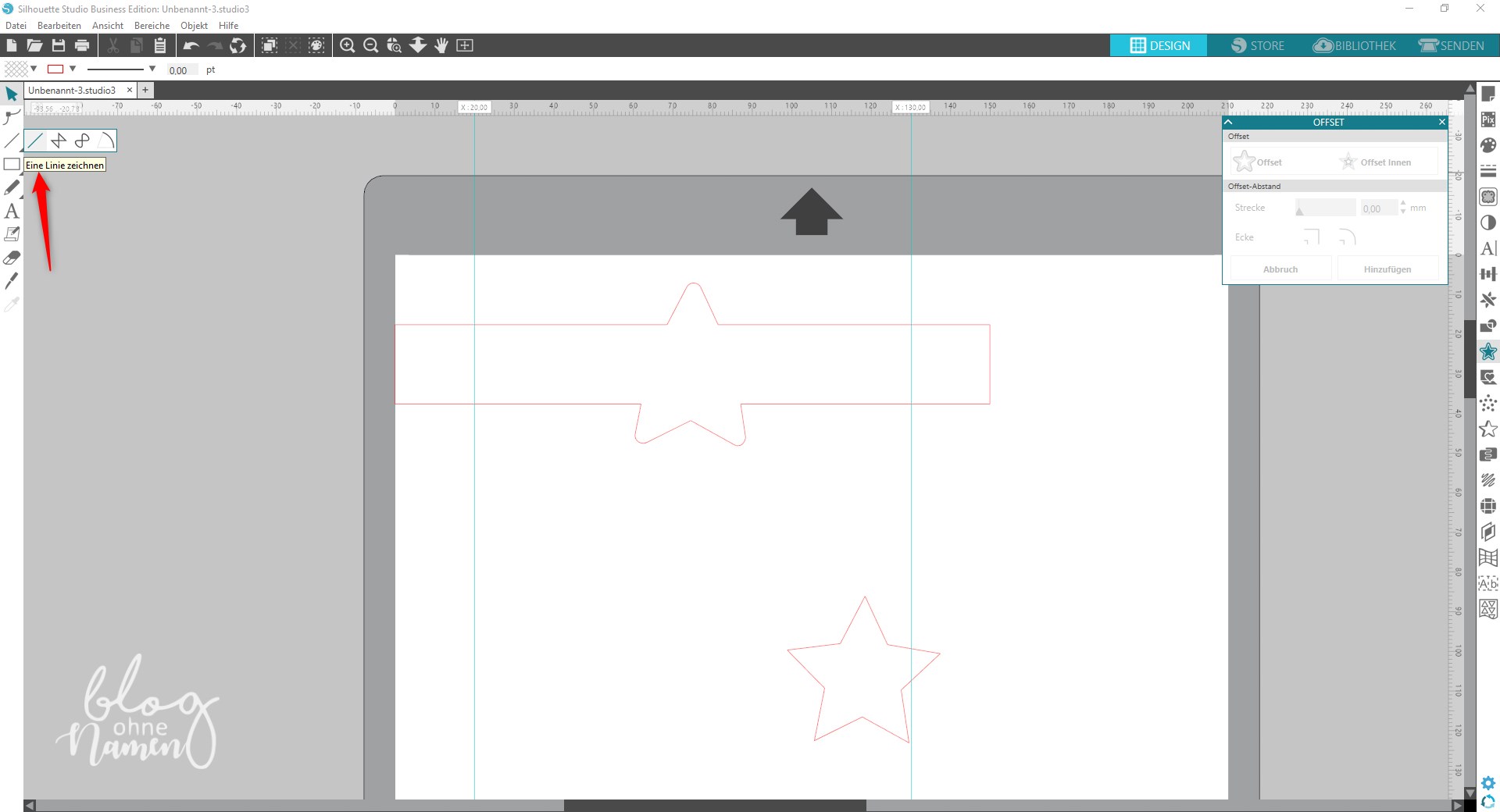Wählt anschließend Eure Form aus – in meinem Fall der Stern – und positioniert diesen über dem Rechteck. Passt das Objekt ggf. noch etwas an, in dem Ihr es vergrößert oder verkleinert. Wählt das Objekt anschließend aus und fügt über die Funktion „Offset“ eine zweite Schnittlinie ein. Den Abstand von Linie zu Linie könnt Ihr selbst mit dem Regler für „Strecke“ bestimmen.