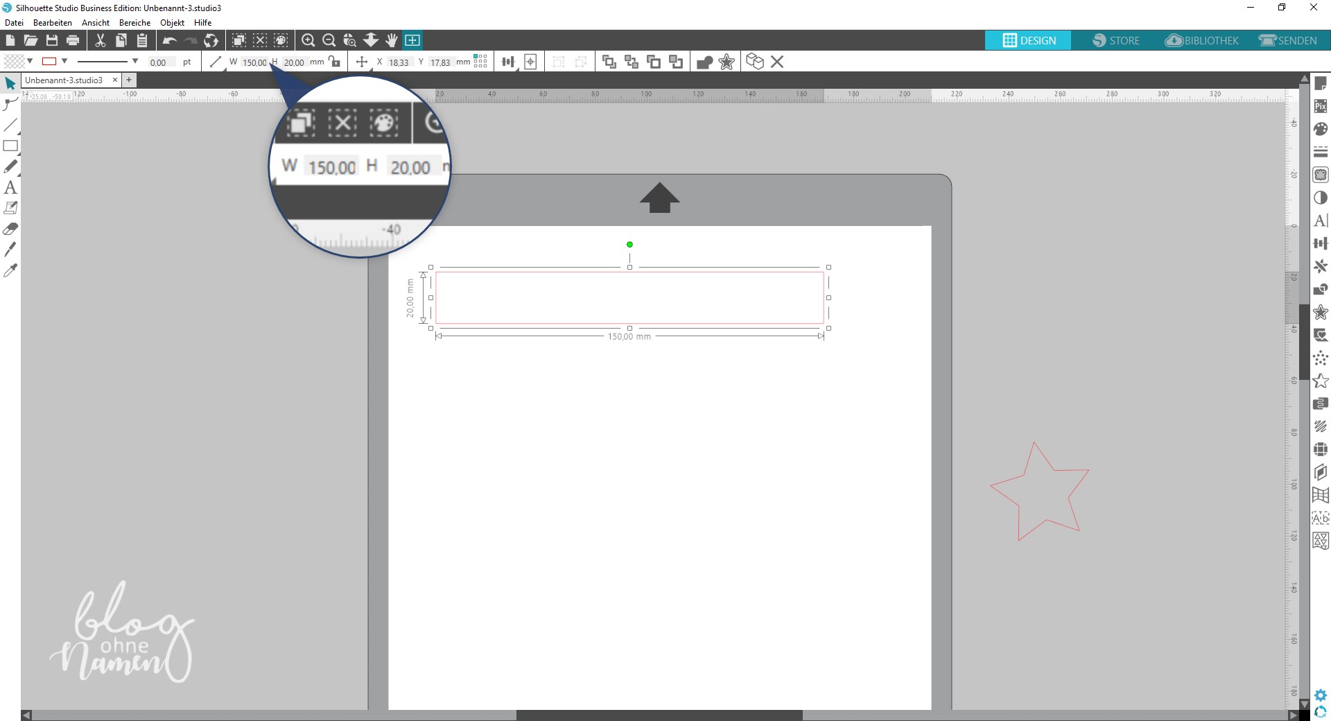 In der oberen Aktionsleiste könnt Ihr die genauen Maße für den „Ring“ angeben. Ich habe mich für eine Länge von 150 mm und eine Höhe von 20 mm entschieden. Hierbei ist schon eingerechnet, dass von der linken und der rechten Seite jeweils 20 mm überlappend sein werden, damit der Ring später geschlossen werden kann.
