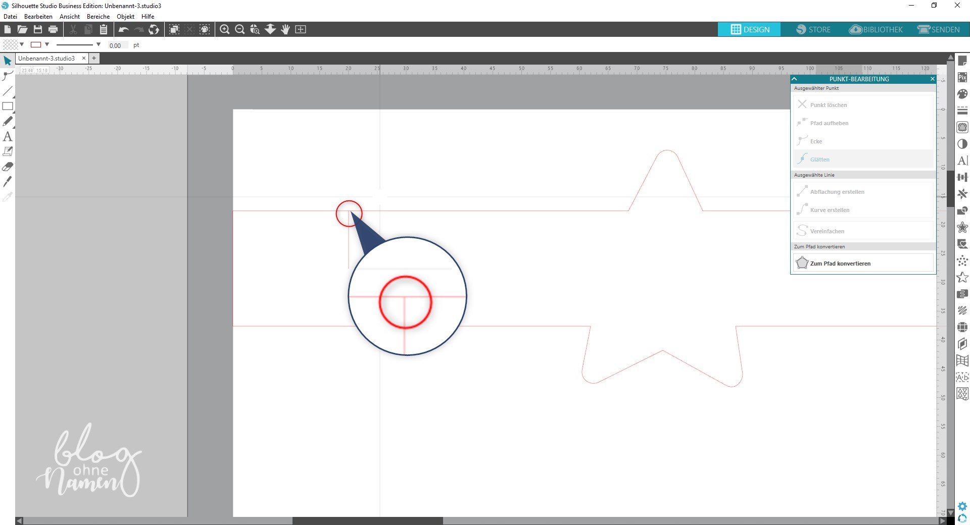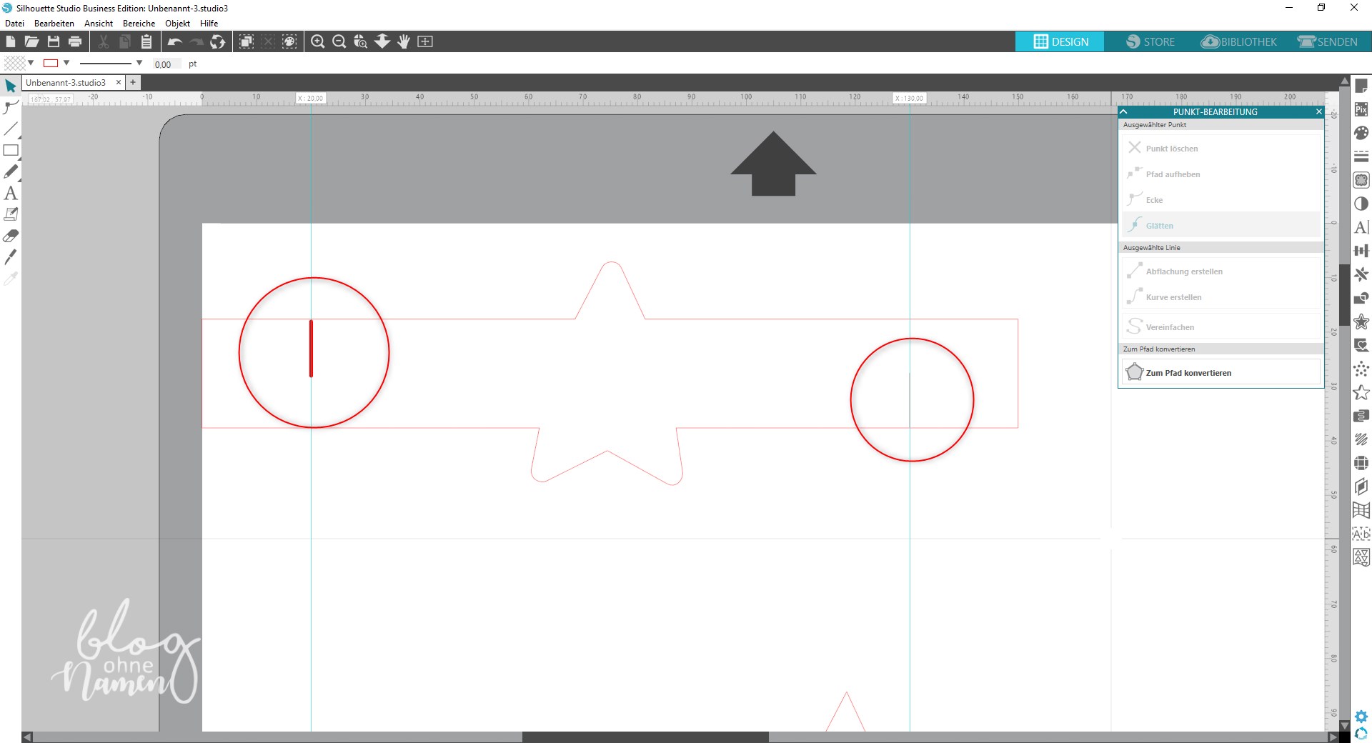 Öffnet die Silhouette Software. Wer mag, der kann in den „Seiteneinstellungen“ unter „Papiergröße“ die Anzeige für den Schnittbereich sowie unter „Optionen“ das Raster ausblenden lassen. Auf meinem Arbeitsbereich liegt hier bereits ein Stern. Sucht Euch eine entsprechende Form, ein Motiv, eine Zahl oder ein Wort aus, welches Ihr auf die Serviettenringe aufbringen möchtet. Legt Euch diese, sofern Ihr möchtet, schon einmal auf den Arbeitsbereich.