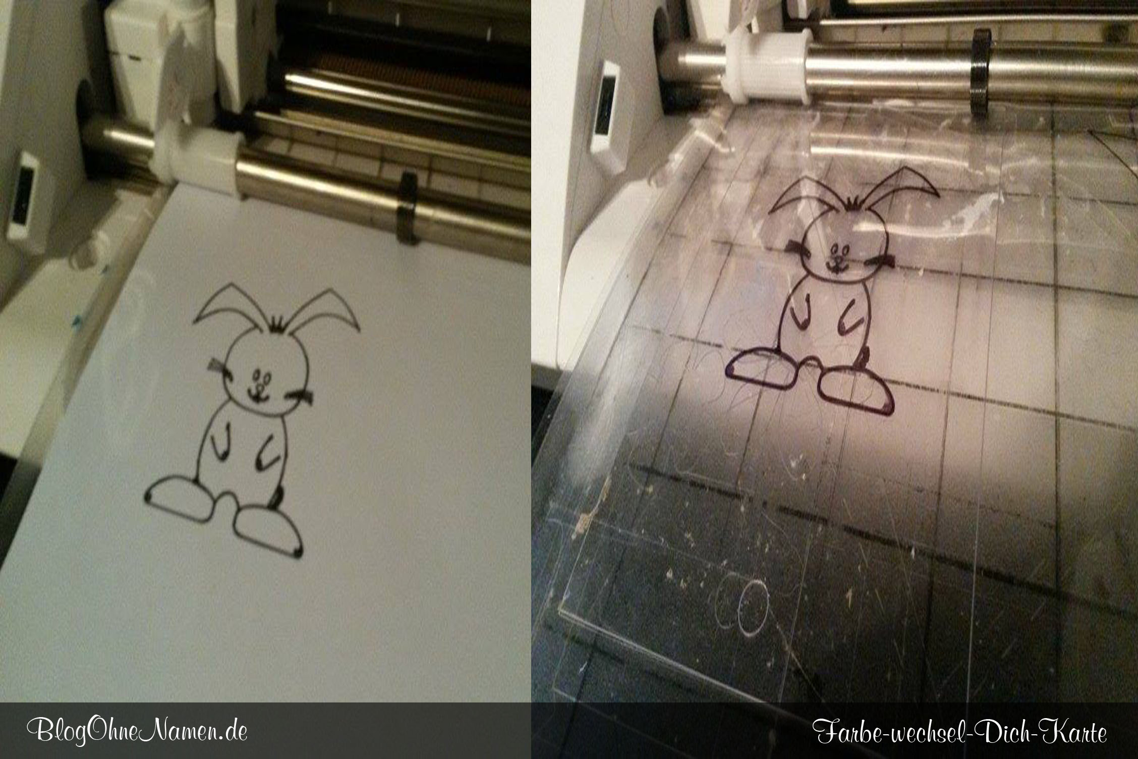 Damit das ganze nun exakt übereinander liegt – und später auch alles ineinander passt, schiebt Ihr die beiden Zuschnitte mit den Hasen am besten in die Karte. So habt Ihr die Möglichkeit, das Löchlein für das spätere Band möglichst genau mit einem Locher oder einer Lochzange o.ä. zu positionieren. Wer möchte, der darf sich aber auch das Loch direkt ausplotten.