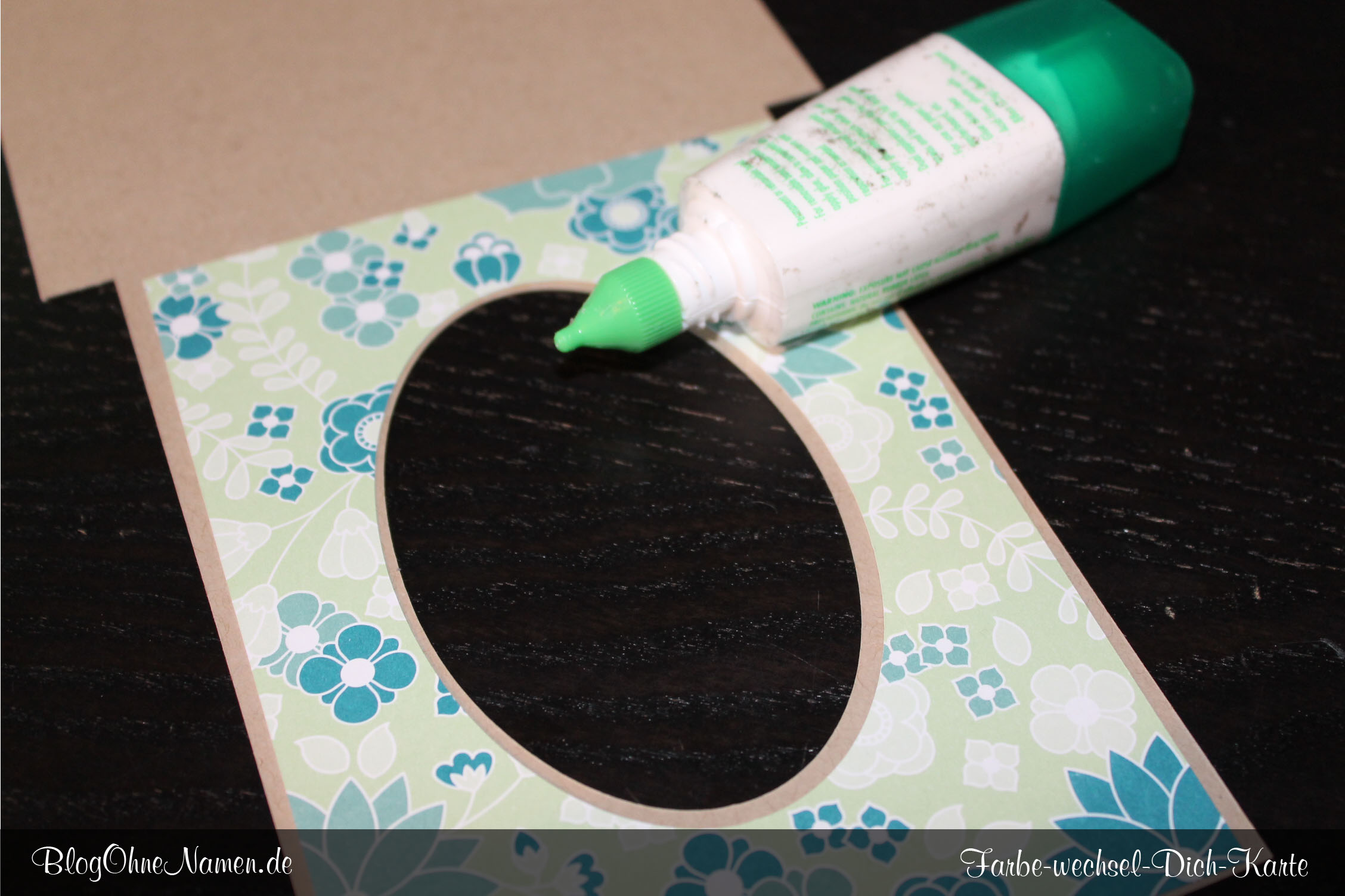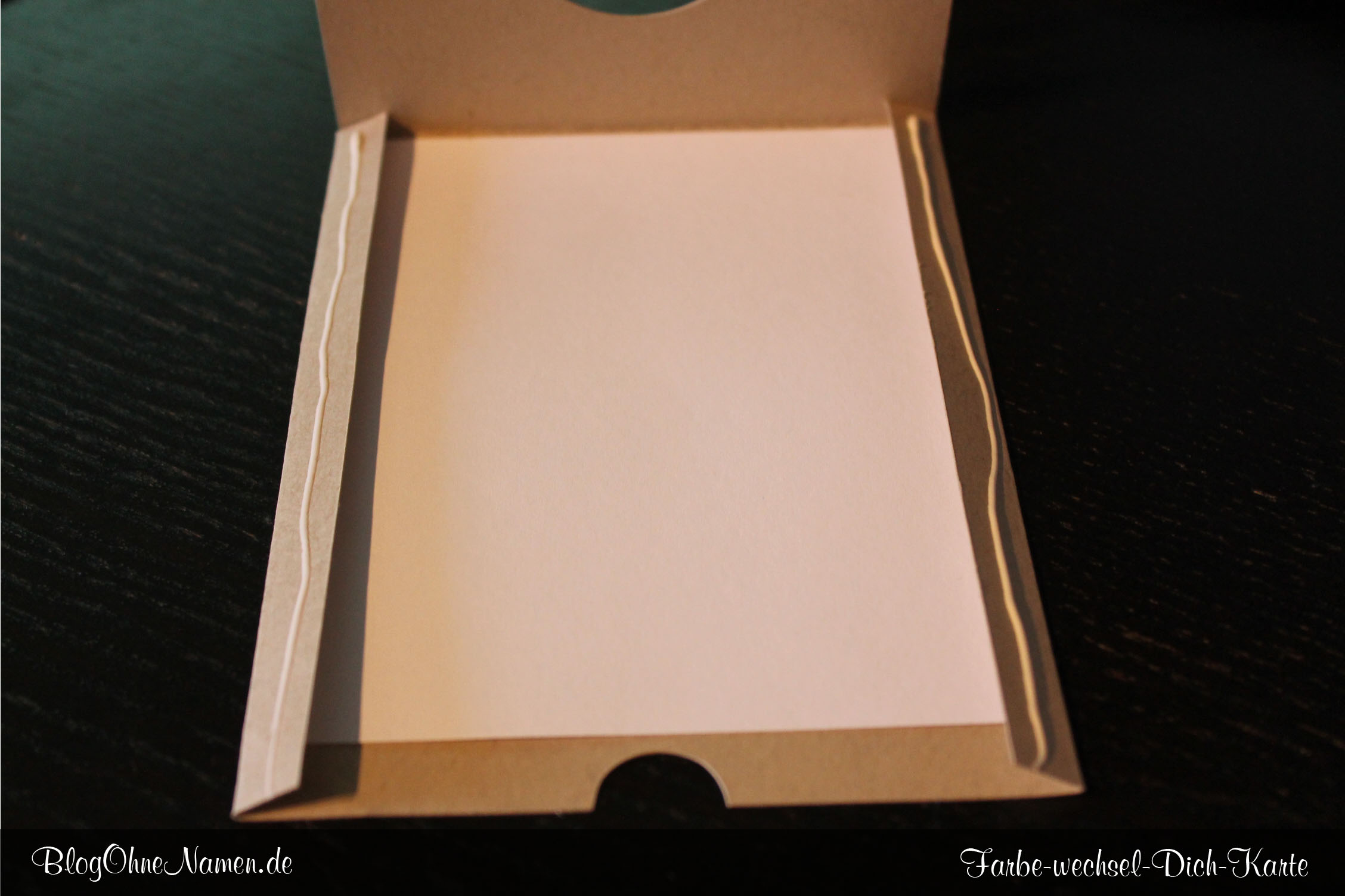 Fächert die beiden Zuschnitte, die Ihr grade mit einem Bändchen verknotet habt, auseinander. Schiebt den Zuschnitt (bei mir ist es auf weißem Farbkarton) unter den weißen Karton, den Ihr vorhin in die Karte eingeklebt habt. Der Zuschnitt aus der Mobilefolie muss über den eingeklebten Karton in die Karte eingeschoben werden.
