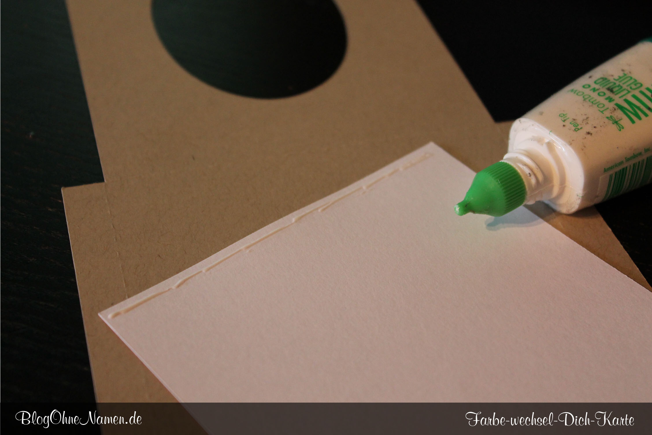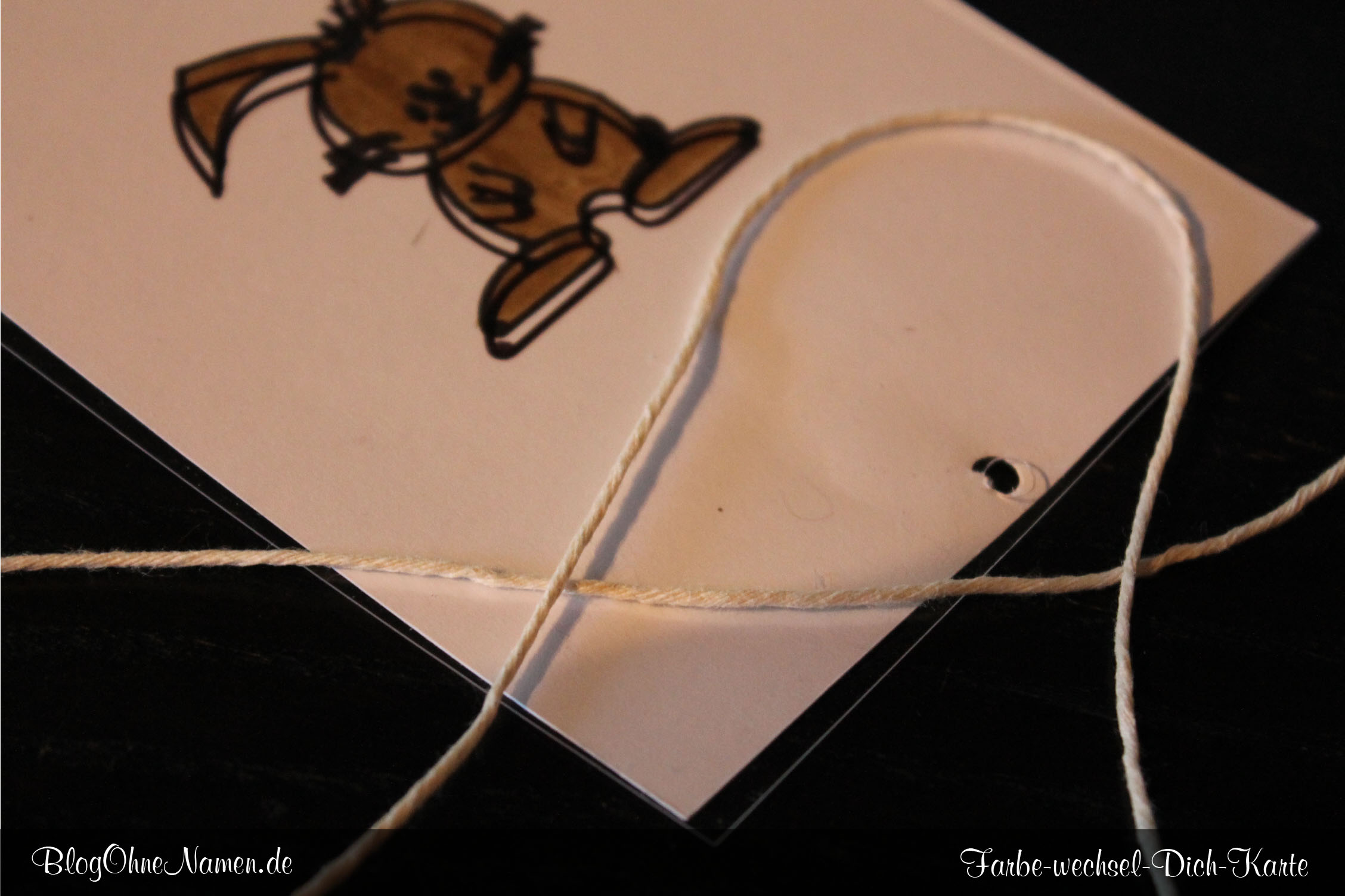 Weiter geht es mit dem, was das die Täuschung erst zu einer Täuschung werden lässt. Der kleine Zuschnitt, der keinen Hasen – bzw. kein Herz aufgezeichnet bekommen hat, gehört „in die Karte“. Damit das ganze funktioniert, müsst Ihr, an der kurzen Seite dieses Zuschnittes NUR am oberen Rand Kleber auftragen.
