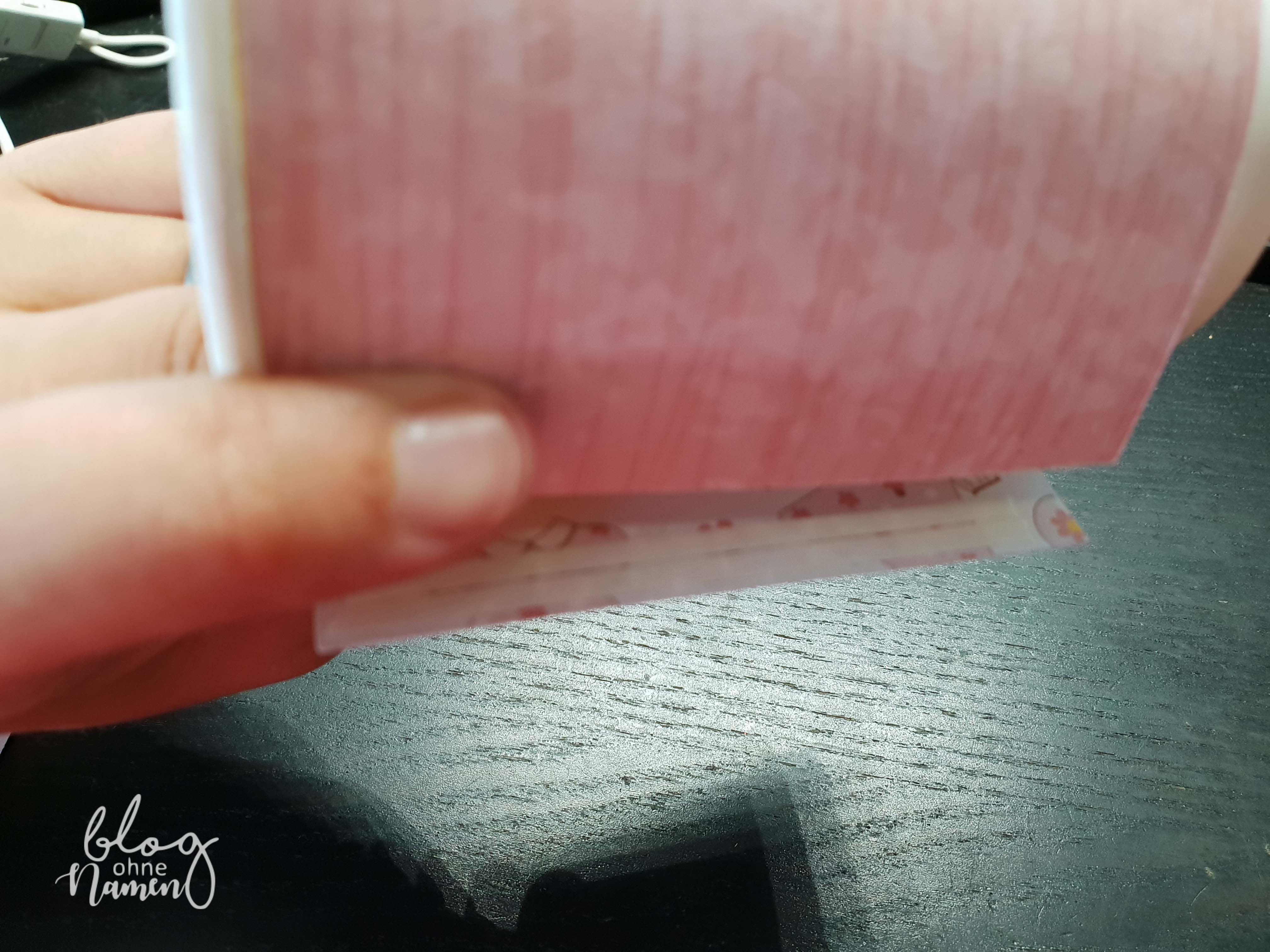 Bevor Ihr die Banderole auf den Becher bringt, klebt an die kurze Seite zwei Streifen des Klebebandes und zieht auch hier die Schutzfolie ab. So müsst Ihr nachher nicht „fummeln“. Als Anfangspunkt wähle ich immer die vorhandene Naht. Diese Naht ist zugleich der Endpunkt.