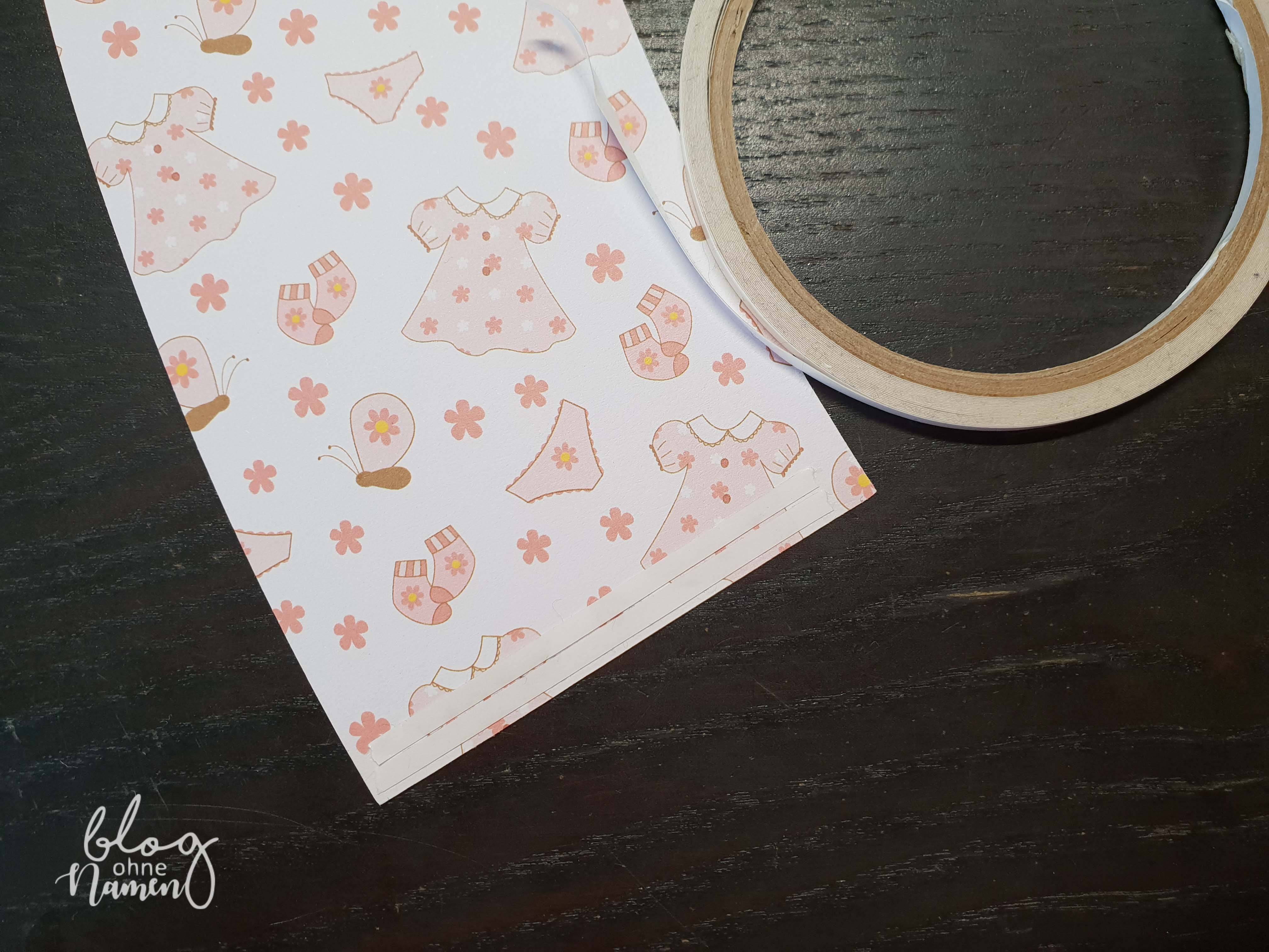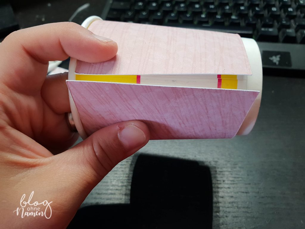 Um zu verhindern, dass die Banderole vom Becher rutscht, sucht die bereits vorhandene „Naht“ am Becher und klebt dort einen Streifen Klebeband auf und zieht den Schutzstreifen ab. Eventuell könnt Ihr noch auf der gegenüberliegenden Seite einen Streifen anbringen. Den ganzen Becher würde ich damit aber nicht vollkleistern, denn so lässt sich die Banderole schwer positionieren.