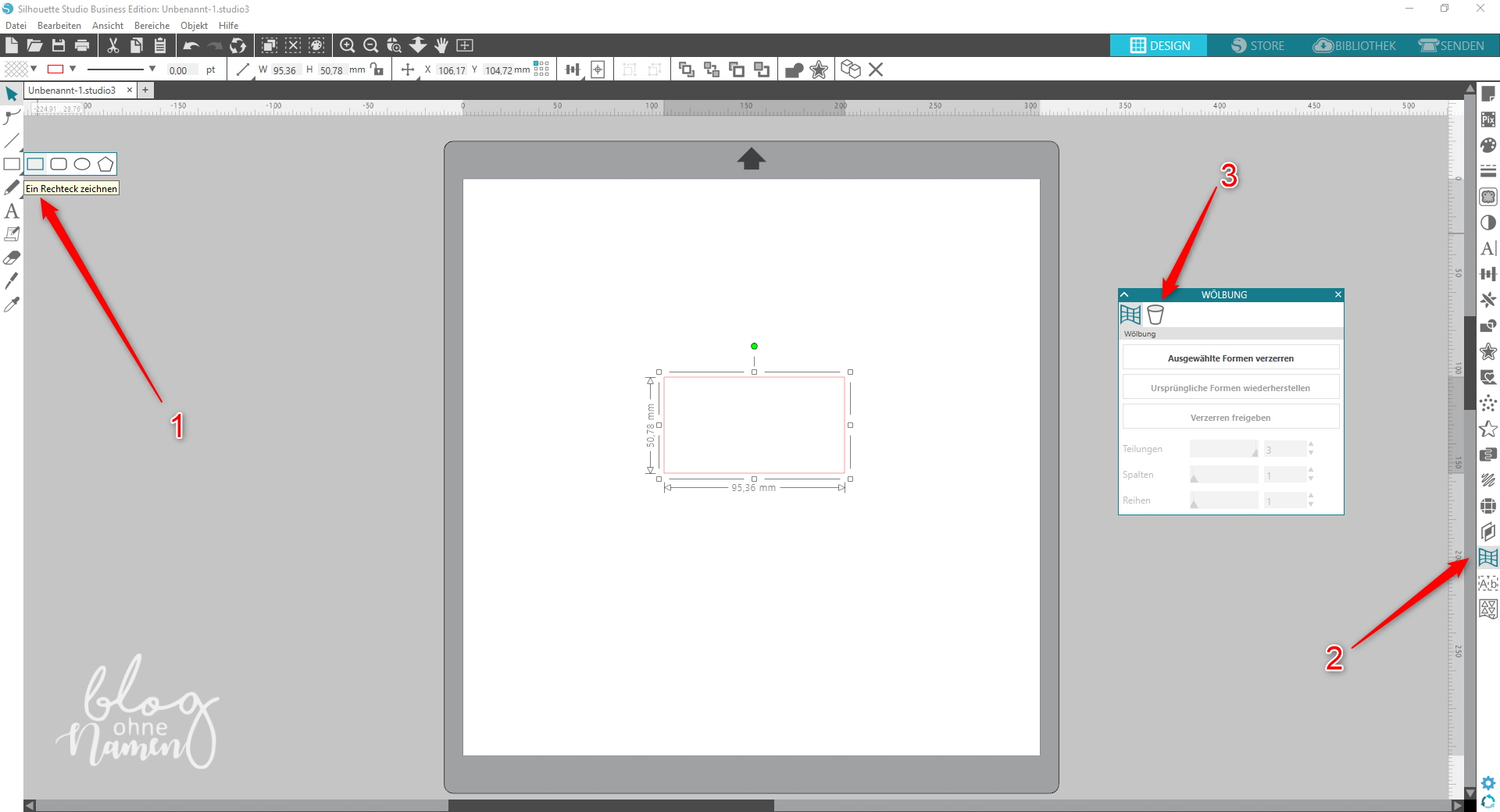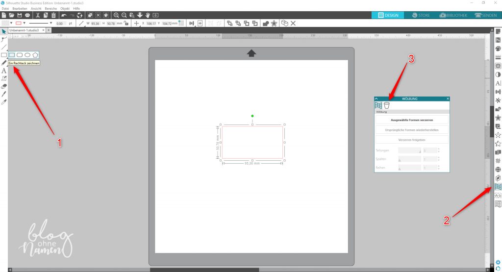 Öffnet die Software, wählt die Funktion „Rechteck zeichnen“ (1) und zeichnet ein Rechteck. Die Größe ist hierbei völlig egal. Wählt dieses aus und geht auf die Funktion „Verzerrungs-Bedienfeld“ (2).  Wählt anschließend den Reiter „Conical Warp“ (3) aus.
