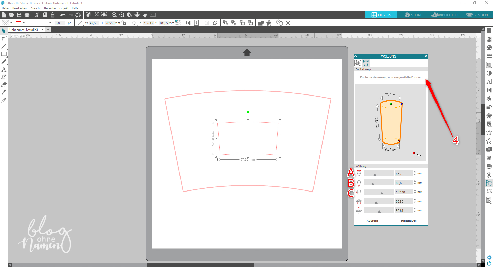Klickt anschließend auf das Feld „Konische Verzerrung von ausgewählten Formen“ (4). Nun sind die Felder für unsere Werte, die vorher grau unterlegt gewesen sind, freigegeben und können entsprechend bearbeitet werden. Gebt in das erste Feld (A) den Wert für den „Oberen Durchmesser“ ein. Im zweiten Feld (B) gebt Ihr den „Unteren Durchmesser“ ein. Bei den Werten handelt es sich, wie oben bereits geschrieben, um die Werte, die nach der obigen Berechnung ermittelt worden sind. Das dritte Feld (C) kann so, wie in der Software angezeigt wird, ausgemessen und direkt übernommen werden.
