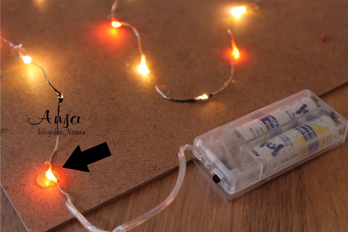 Die Lichterkette könnt Ihr entweder mit Watte in den Rahmen legen, oder wie hier, wieder am hinteren Deckel mit Klebepunkten befestigen.