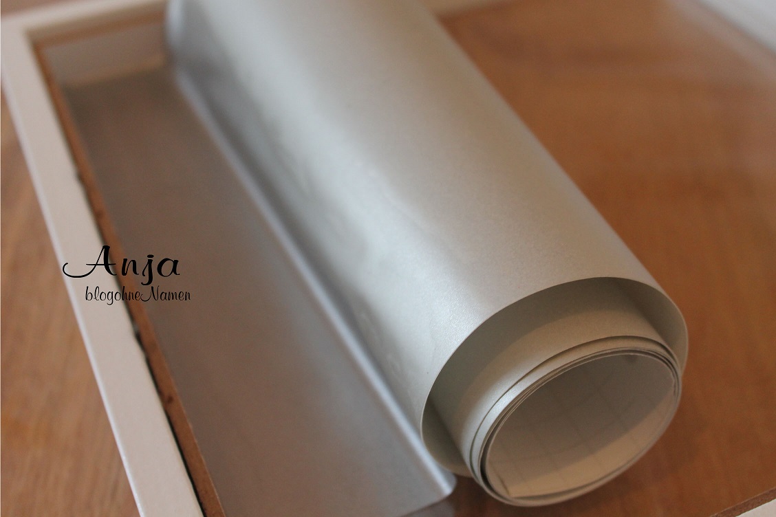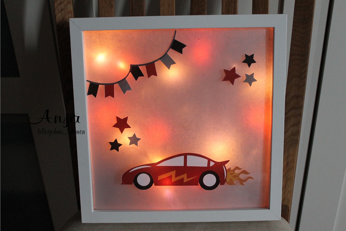 Ich habe noch ein Blatt Transparentpapier zugeschnitten und von Innen vor die Lichterkette gelegt. Damit das Licht noch etwas gedämmt wird. Der Bilderrahmen soll schließlich als Nachtlicht dienen. 😉
