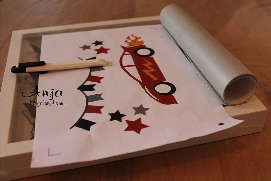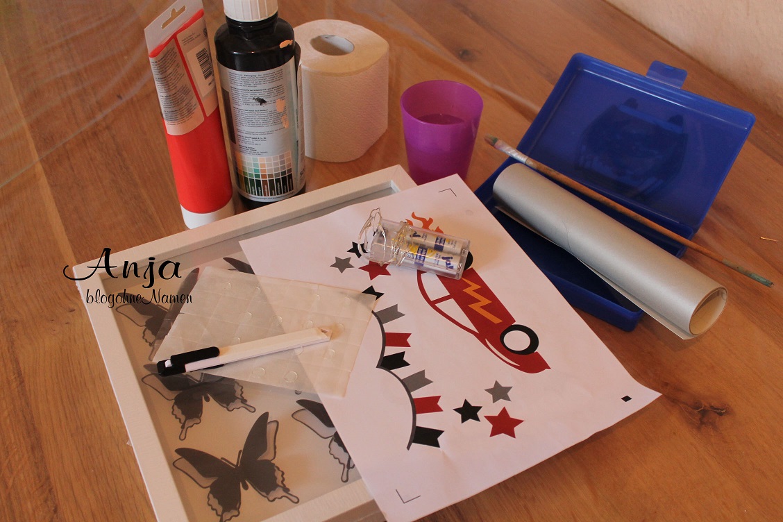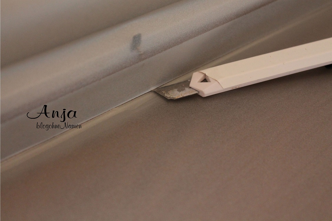 Für die nächsten Schritte benötigt Ihr die auf dem Foto abgebildeten Materialien. Ich habe mich für Ätzeffektfolie von Oracal entschieden. Da meine Folie wesentlich kleiner als der Rahmen gewesen ist, musste ich das ganze noch zurecht schneiden um die Scheibe komplett zu bedecken.