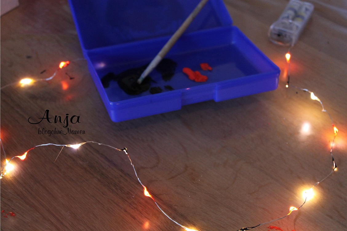Ich habe mich für zwei Farben entschieden, die zu meinem Motiv passen. Also Rot und Schwarz. Das Schwarz erkennt man allerdings kaum – bis gar nicht. Die einzelnen Lichter wurden mit dem Pinsel und ein wenig Farbe „gefärbt“.Dank LED passiert auch nichts. Das ganze solltet Ihr zu Beginn machen, damit die Farbe genug Zeit zum trocknen hat. 🙂