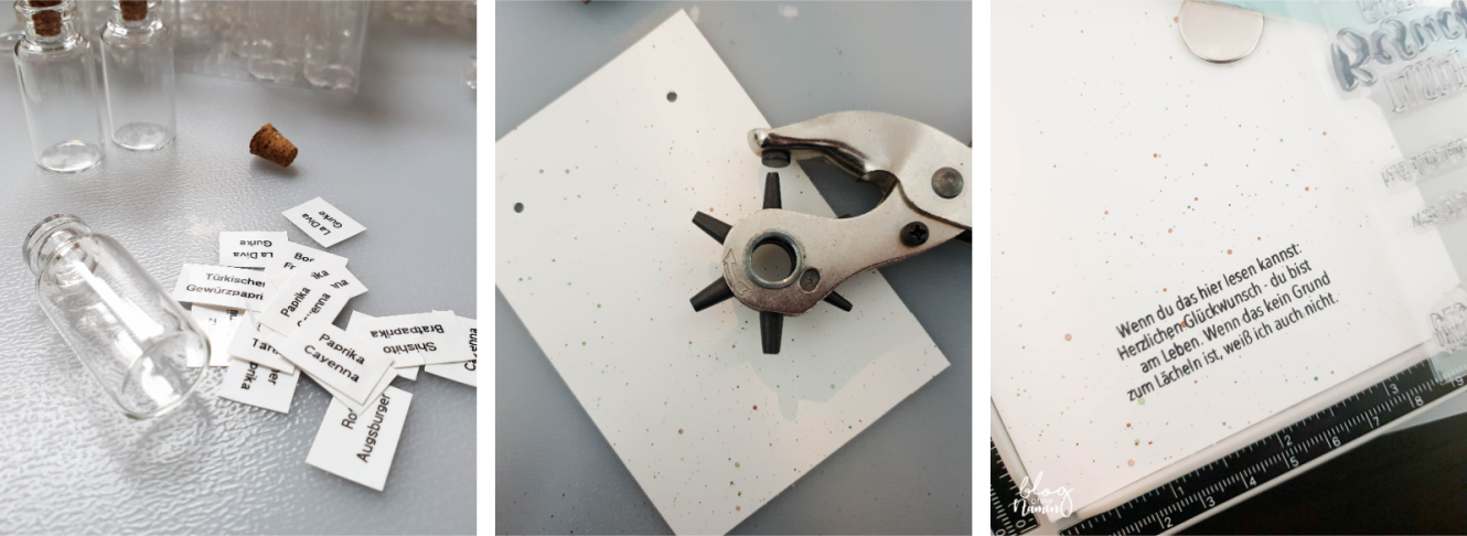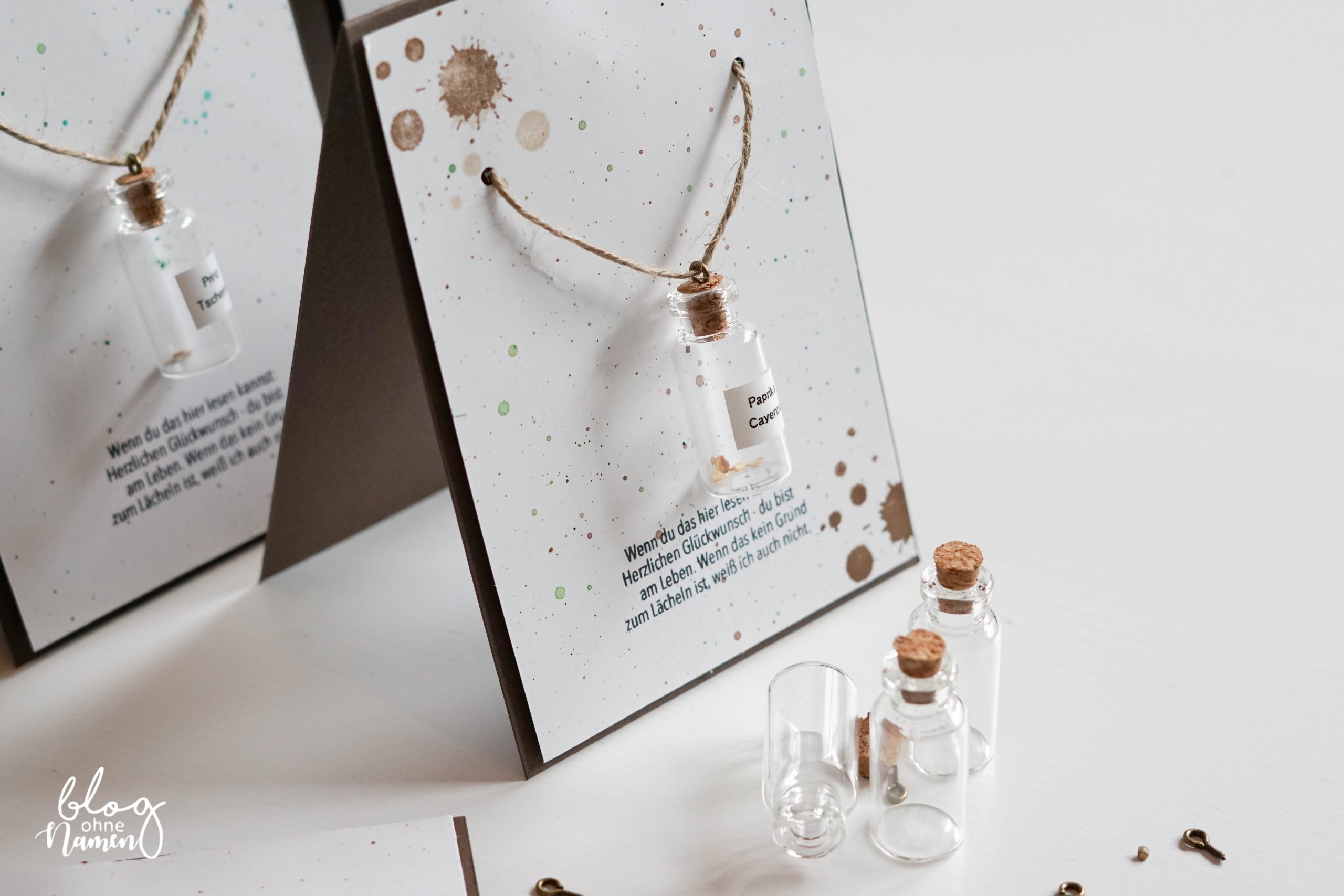 Anschließend wurden die Flaschen mit den Korken verschlossen und die Öse eingedreht. Diese wurde zuvor, am Gewinde, mit einem Tropfen Sekundenkleber versehen. Für mehr Stabilität und ein einfacheres öffnen. Durch die Öse wurde dann das Bändchen gefädelt. Den Hintergrund meiner Karte habe ich ein wenig besprenkelt – man kennt es von mir. Anschließend wurden die Löcher für das Bändchen (2 cm vom Rand entfernt) angebracht.