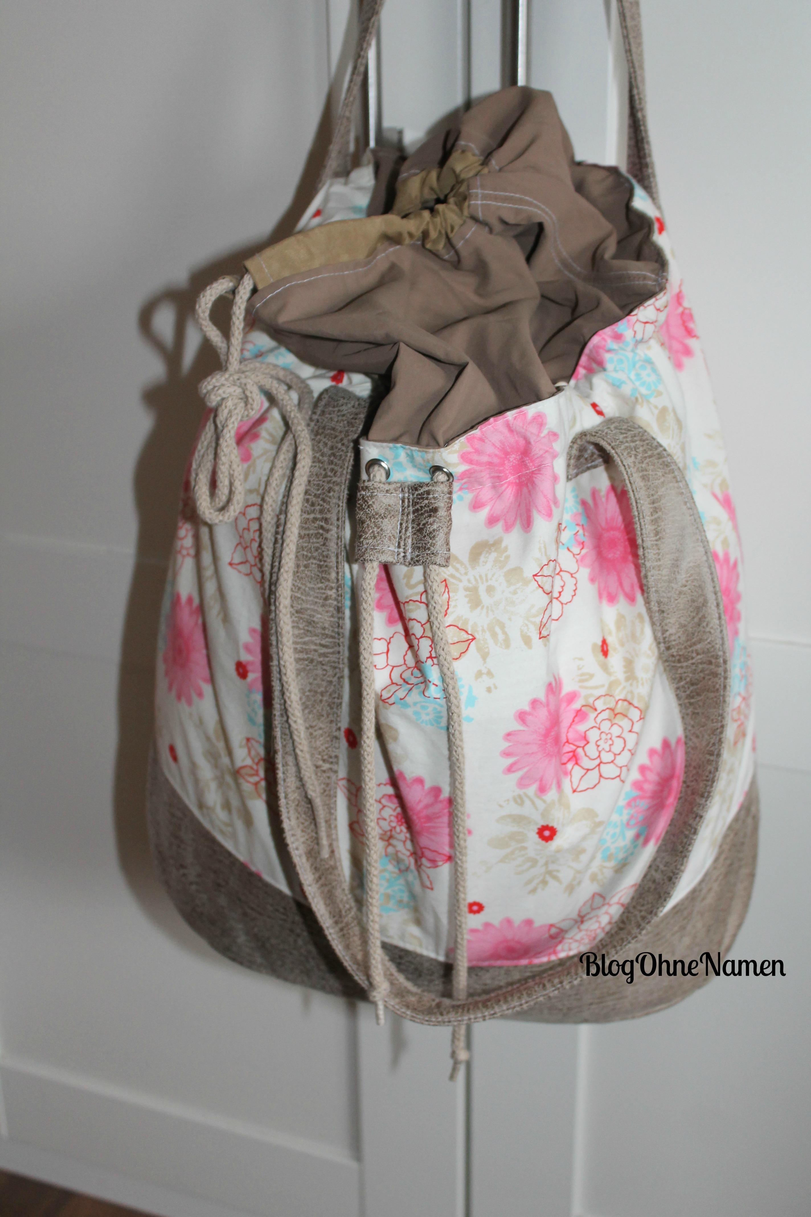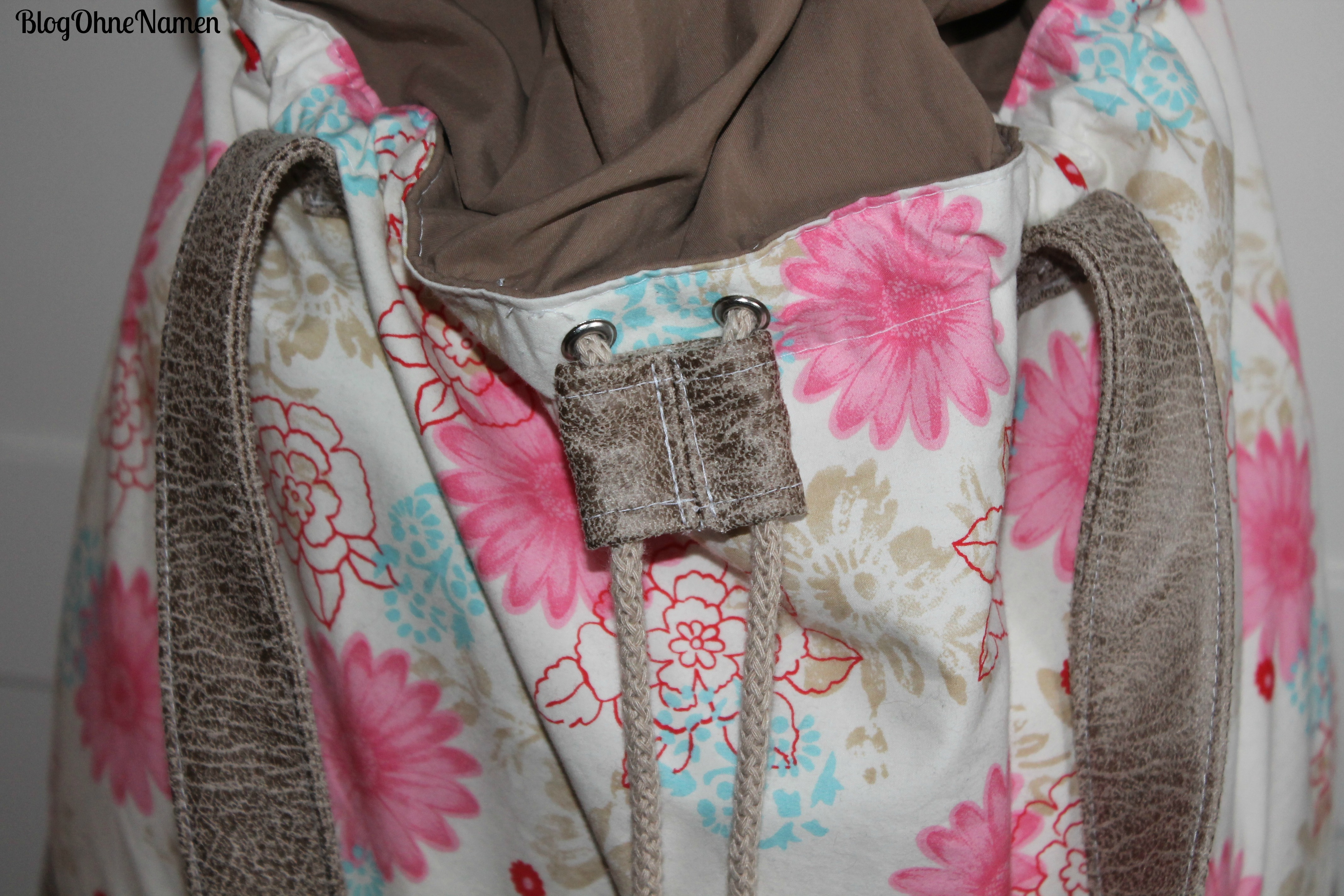 Neben dem Boden, dem unteren Teil des Beutels und dem Kordelstopper sind auch die Träger aus Vintage Kunstleder gearbeitet. Das hatte ich vor einer Weile bereits bei meiner Fotobella gemacht. Das „Tragegefühl“ ist wirklich sehr angenehm. Außerdem passt so alles wirklich gut zueinander – und Träger sind ja wirklich flott genäht.