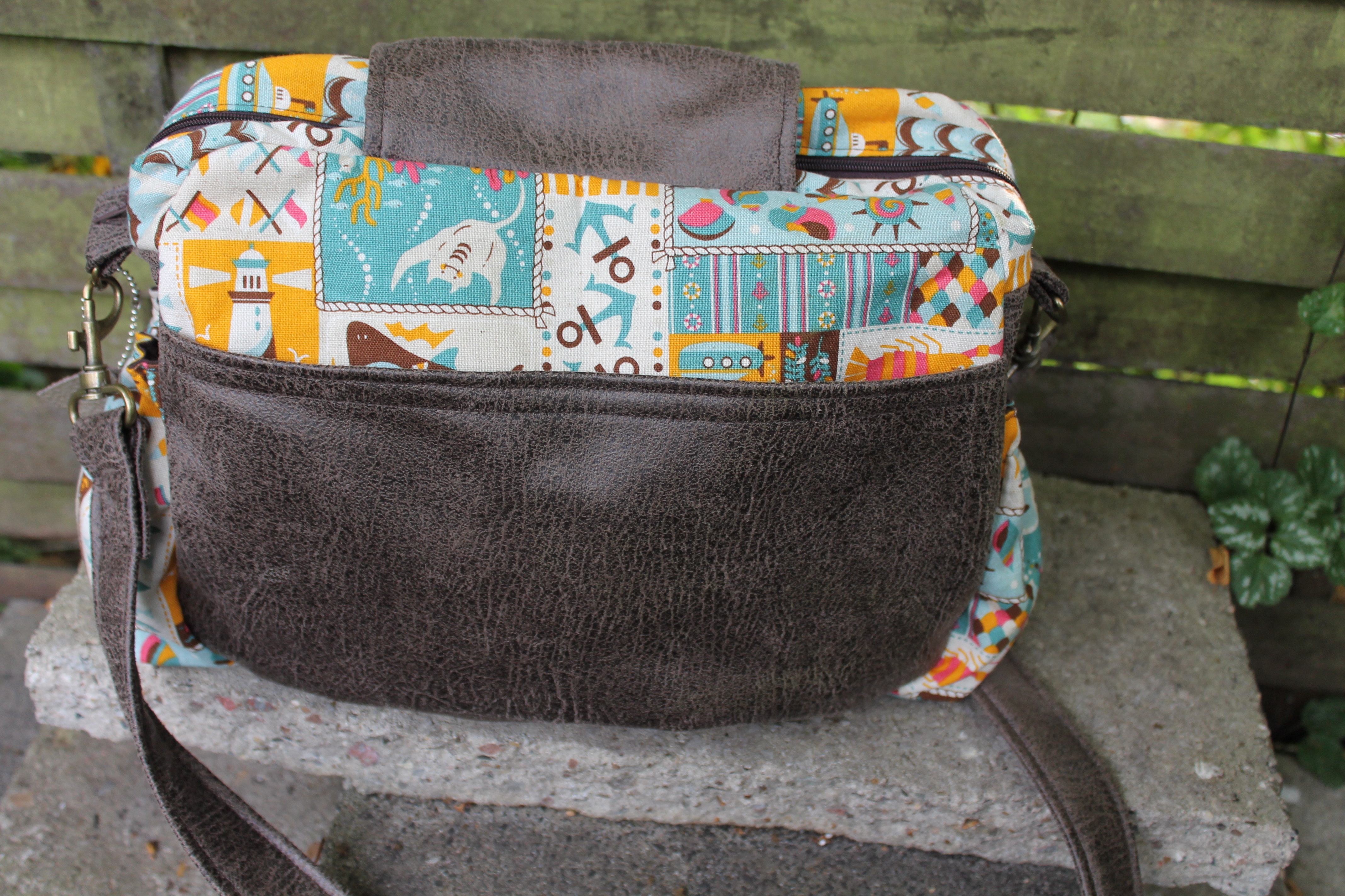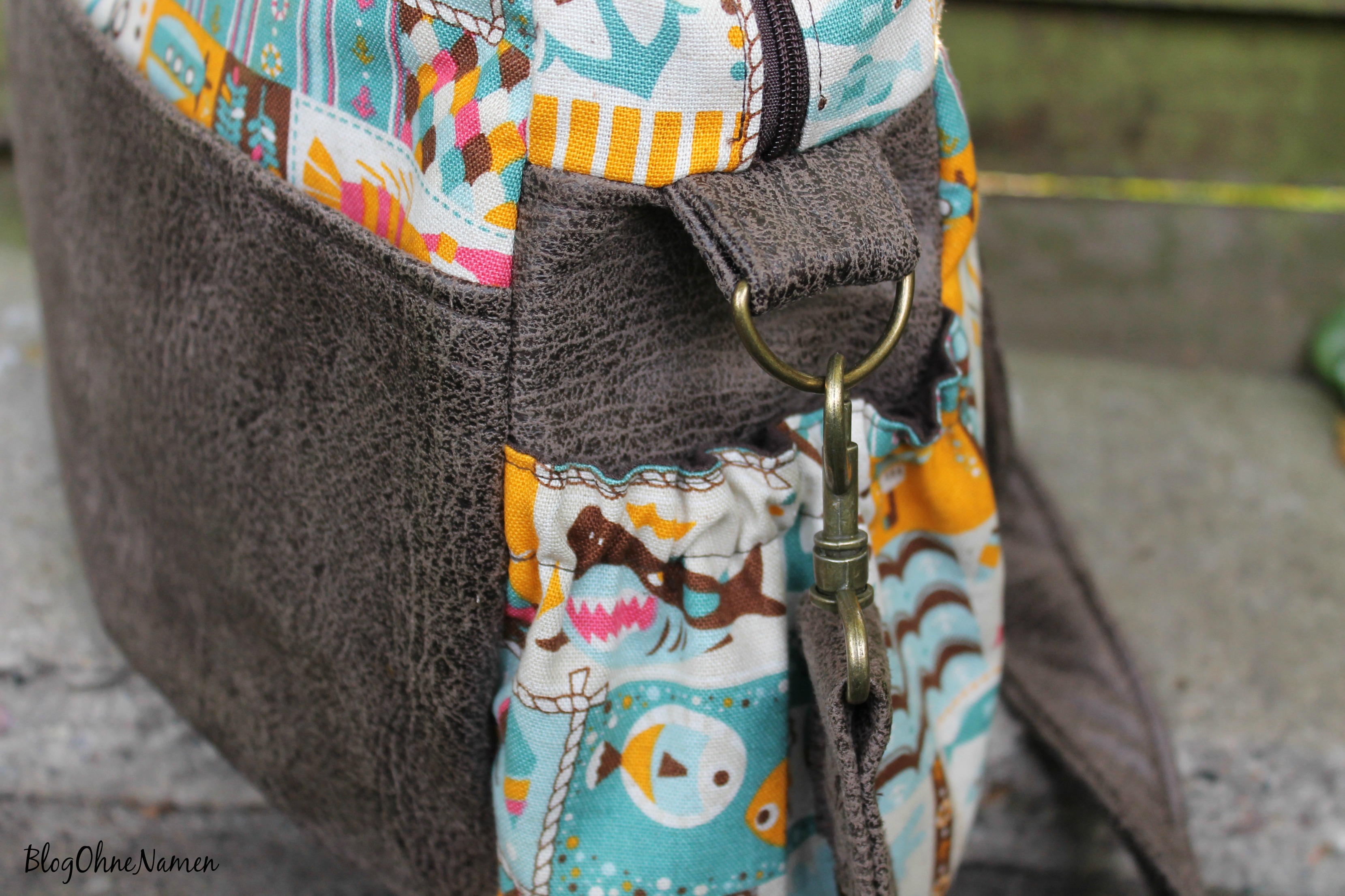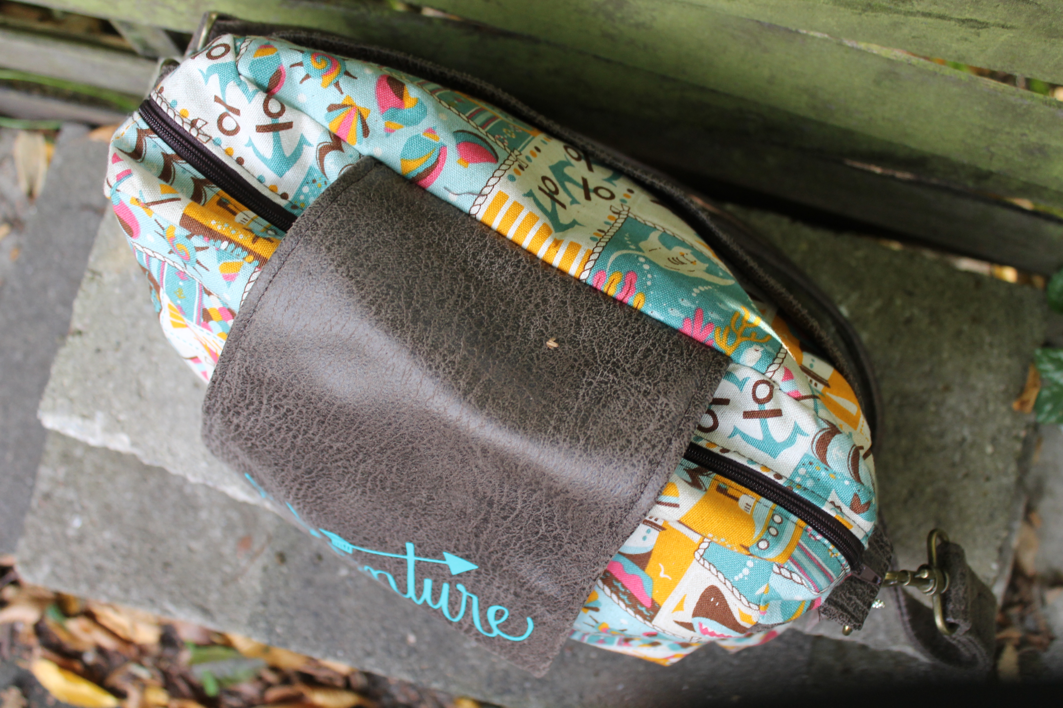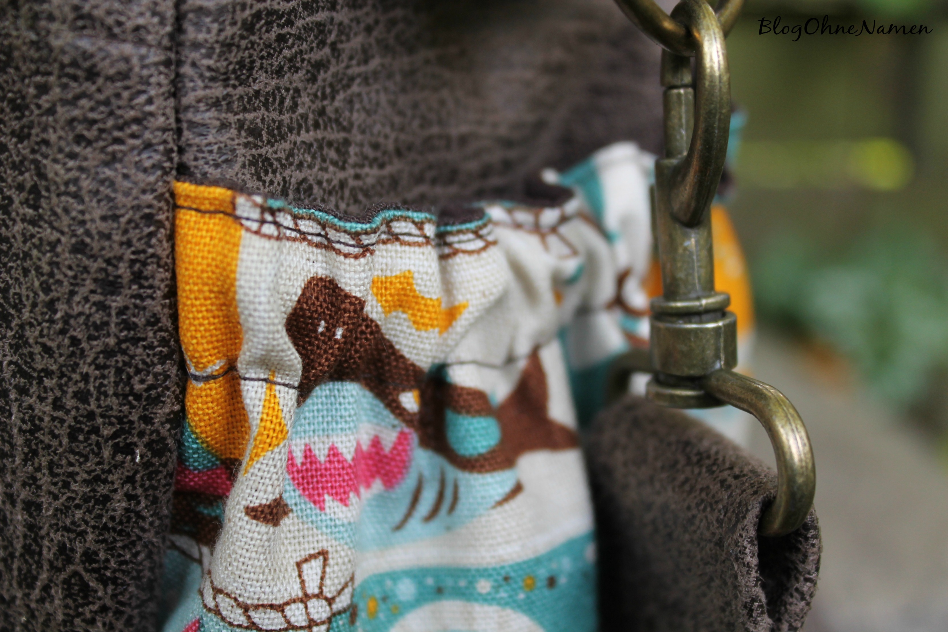 Die Stoffkombination lag schon längere Zeit auf einem extra Häufchen in meinem Stoffschrank – die gefiel von Anfang an und hat irgendwie direkt miteinander harmoniert. Der gemusterte Stoff wäre eigentlich gar nicht mein Fall, wenn da nicht die tollen Farben gewesen wären(ein tolles Kaufargument,oder?). Das Kunsterleder in Antikoptik stand auch schon gaaaaaanz lange auf meiner „haben-will-Liste“. Von der Haptik ist es ganz weich und fühlt sich unglaublich toll an.