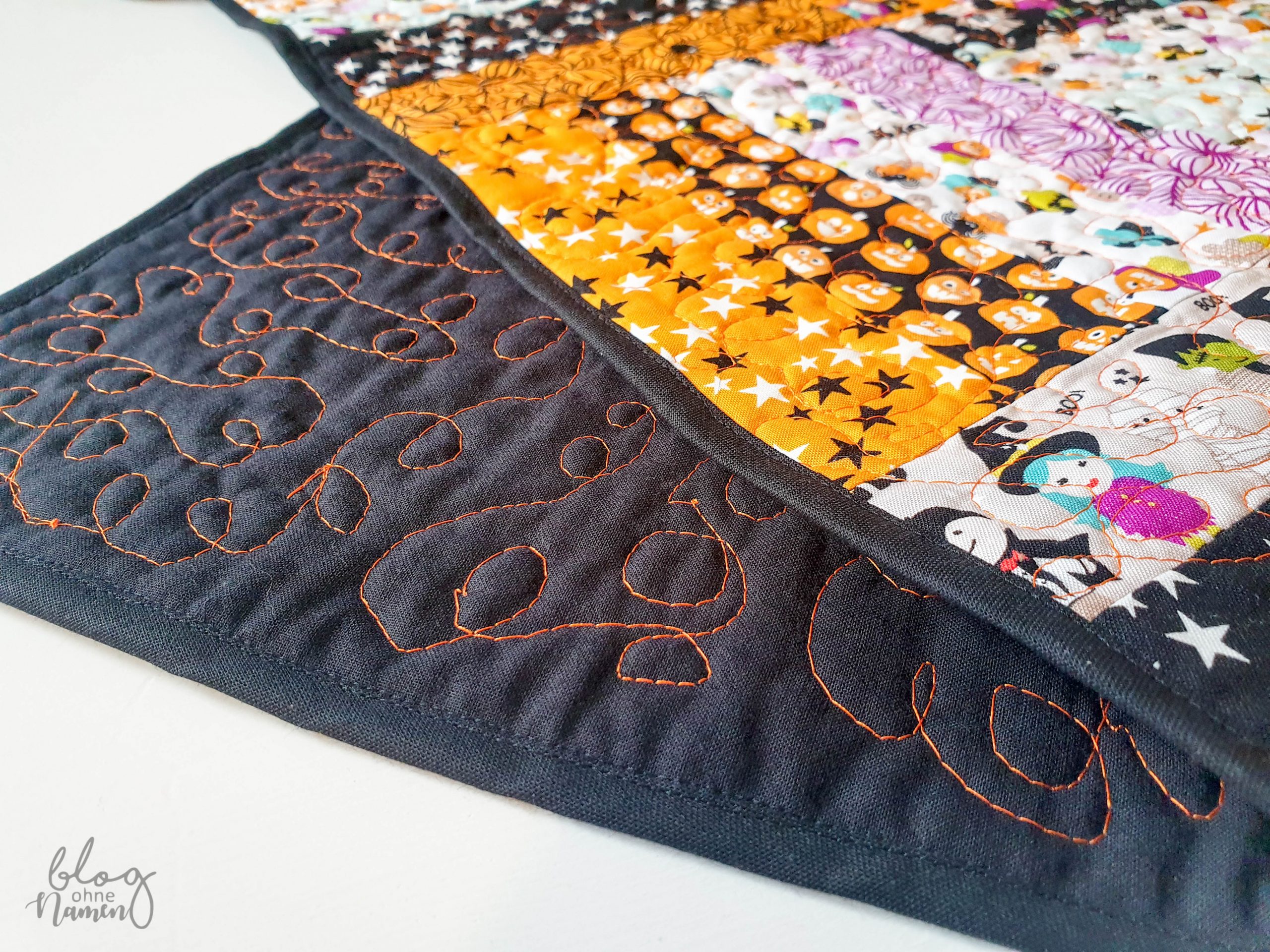 Mit dem Ergebnis bin ich auf jeden Fall mehr als zufrieden. Besonders das Freihandquilten hatte ich mir wesentlich problematischer und unansehnlicher vorgestellt. Zur Fertiggstellung wurde der Tischläufer dann noch mit einem schwarzen Schrägband eingefasst.