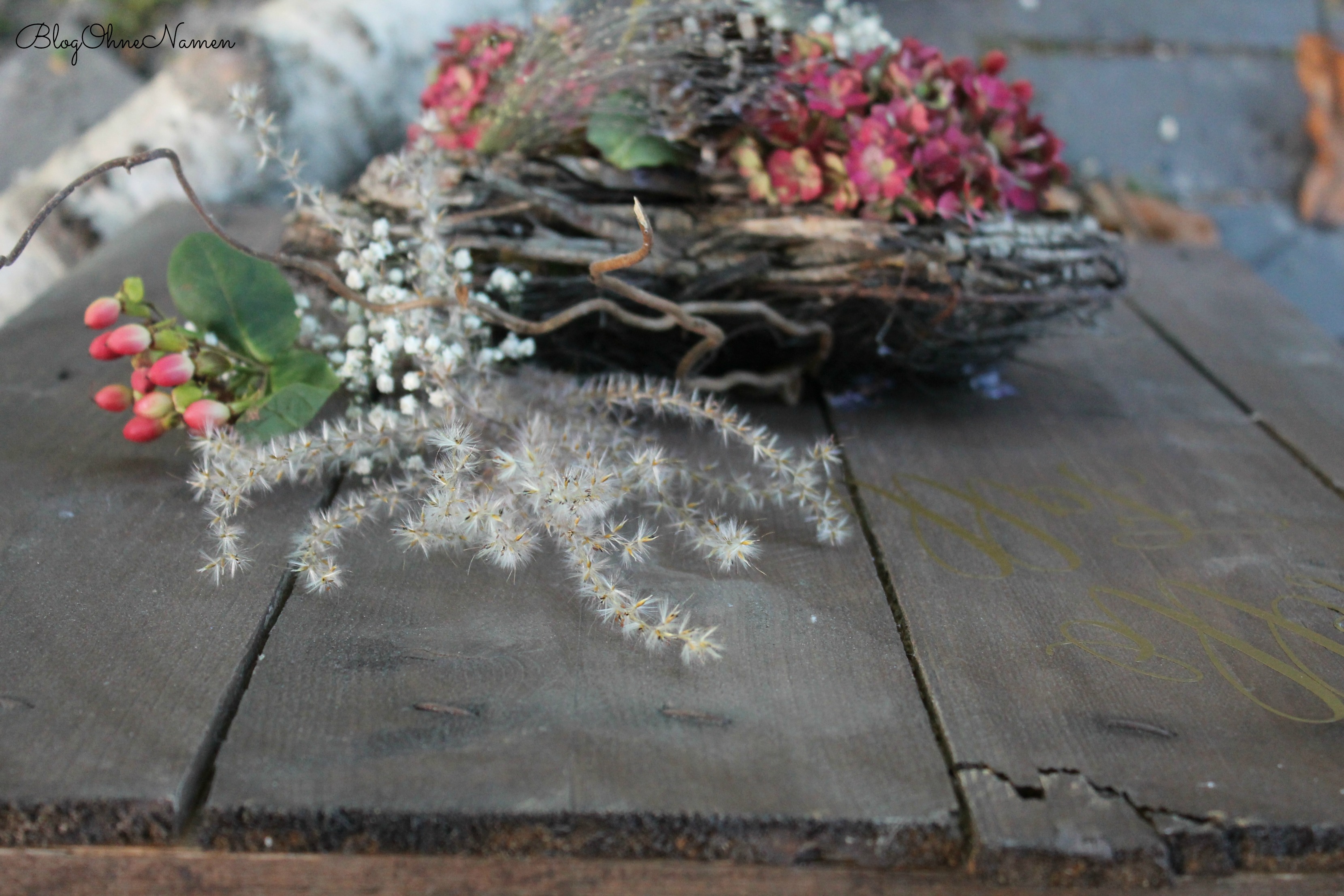Hier wurde eine alte Palette einfach mit einem Rest Holzschutzfarbe angestrichen und anschließend mit diversen Überbleibsen aus dem Garten dekoriert. Was man so findet… 😉