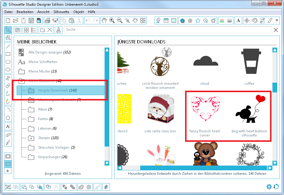 Je nach Gerät, wird jeder andere Vorlagen bereits in der Silhouette Software installiert haben. Damit jeder die Möglichkeit hat sich an der gleichen Datei zu versuchen, habe ich einige Designs aus dem Silhouette Design Store herausgesucht. Diese unterscheiden sich zwar vom Aussehen, sind aber vom Prinzip das gleiche.