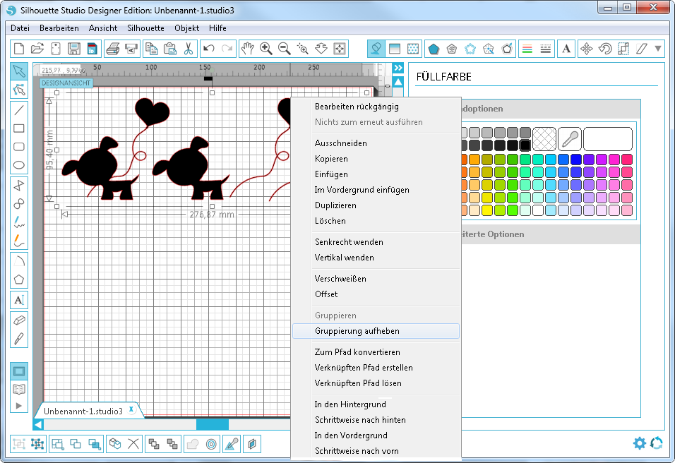 Wir wollen aber nur Teile – also einzelne Elemente – dieser Gruppe benutzen. Aus diesem Grund müssen wir die Gruppierung aufheben. Das geht ganz einfach: Einfach die Gruppe (beim anklicken eines der Motive wird direkt die ganze Gruppe – also alle Elemente in einer Gruppe) anklicken und mit der Rechten Maustaste drauf klicken. Nun erscheint ein Menü in dem Ihr die Funktion “Gruppierung aufheben” findet. (S. Bild oben)