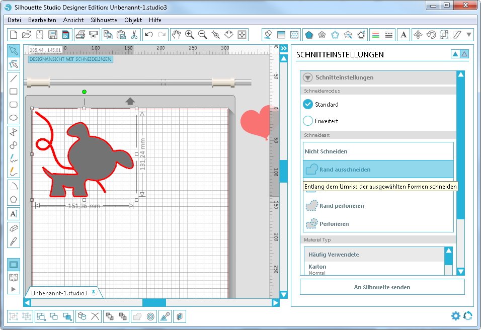 Nun geht Ihr in die Schnitteinstellungen und wählt das Motiv aus. Da der Hund keine Augen oder einen Mund besitzt, können wir die Schneideart auf “Rand ausschneiden” setzen. Wenn der Hund hingegen einen Mund und Augen haben würde, dann würden wir die Schnittart auf “Schneiden” setzen. Dann würden auch die Augen und der Mund mit ausgeschnitten werden.