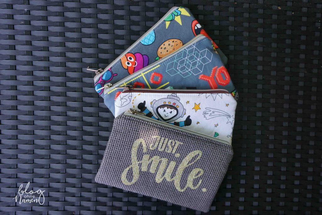 Aus einigen Resten habe ich dann 3 verschiedene Täschlein genäht von denen sich der Mini dann eine aussuchen konnte. Benutzt hatte ich verschiedene Stoffe, so z.B. einen zum ausmalen, dem ich mit den Textilstiften von Javana* ein bisschen Farbe verpasst hatte. Desweiteren ist eines aus Sommersweat und eines aus Webware entstanden. Mit allen Materialien hat es gut geklappt – diesmal auch mit dem Reißverschluss. Bisher war das, mit der neuen Maschine, immer ein wenig problematisch. Nun habe ich den „Kniff“ mit dem Reißverschlussfuß herausgefunden und bin ganz begeistert davon, wie toll sich damit arbeiten lässt.