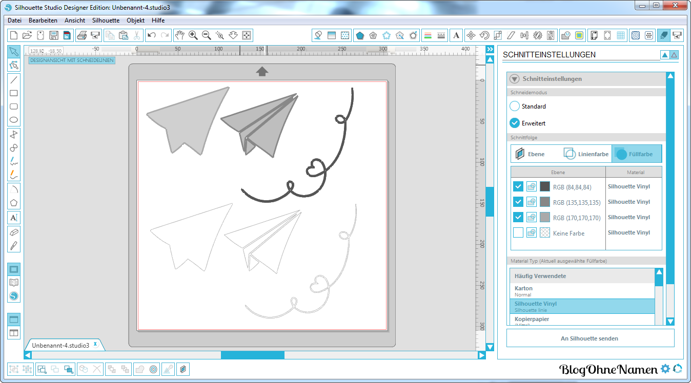Vor dem Schneiden sollten entprechend getrennt werden: Zieht dafür – sofern Ihr das noch nicht getan habt – die verschiedenen Ebenen auseinander. Habt Ihr mehrere Teile, die zusammenhängend aus einer Farbe ausgeplottet werden sollen, dann gruppiert diese am besten.