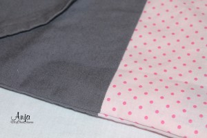 Ich glaube dieser Schnitt gehört zu den Kuriertaschen Schnitten. Kann das sein? Das der Teil der Öffnung nach vorn, – oder hinten übergeklappt wird, finde ich ziemlich genial. Der Stoff ist von Tedox (4,- /lfm) und für mich zum ausprobieren einfach perfekt. Der Stoff ist schön fest und nicht so labbrig. Weil ich mir jeweils nur einen halben Meter gekauft hatte, habe ich beide Stoffe kombiniert und den Boden sowie den oberen Abschluss aus gepunktetem Rosa (!) Stoff gemacht. Die Außenteile habe ich mit Volumenvlies versehen.