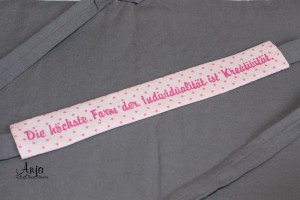 Am Träger habe ich noch ein Polster angebracht. Einfach weil´s schicker aussieht. Auf dem Polster ist noch ein “Zitat”. Mein Mann und ich haben ewig diskustiert, was sich besser anhört. Die oder kein Die – das war die Frage. Der Sohn hat per Los entschieden. 😉
