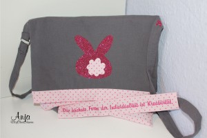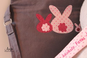 Auf dem Umschlag, der nach vorn zeigt habe ich noch einen großen Hasen aus Glitzerflex aufgeplottet. Das Schwänzchen ist aus Stoff – und Nein: NICHT MIT VLIESOFIX BEFESTIGT! 😛