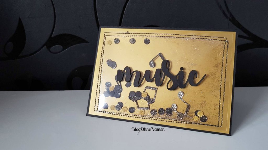 Zum Schluss hatte ich mir noch einen Schriftzug „music“ ausgeplottet. Dieses wurde mit halbierten 3D-Klebepads* auf die transparente Folie aufgebracht. So sieht die Karte nicht ganz so langweilig aus,oder? Wer möchte, der kann auch Vinylfolie aufbringen. Wie das aussieht, könnt Ihr Euch hier anschauen.
