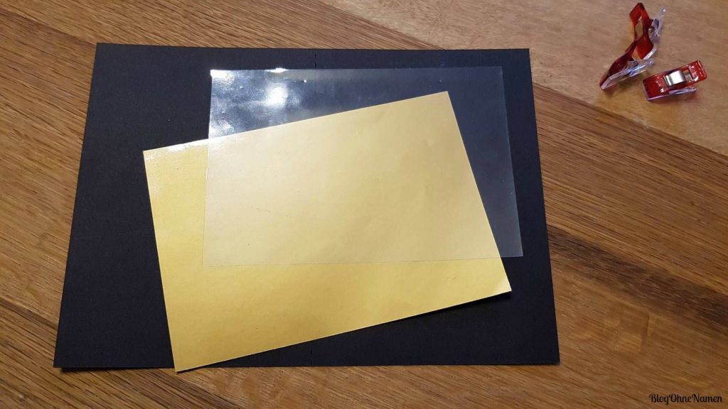 Schneidet die erstellten Zuschnitte aus dem gewünschten Karton aus. Zuerst wird das Schüttelfenster gemacht. Achtet vor dem Nähen darauf, dass die Folie sauber und frei von Verschmutzungen ist – die bekommt man am Ende nämlich schwer bis gar nicht mehr enfernt. Im Normalfall kann man die durchsichtige Folie und den Zuschnitt für den Untergrund der Schütteltasche mit Kunststoff-Clips* zusammenhalten – damit nichts verutscht. Bei mir ging das leider nicht, weil ich Folien-Papier hatte und das ziemlich empfindlich reagiert.