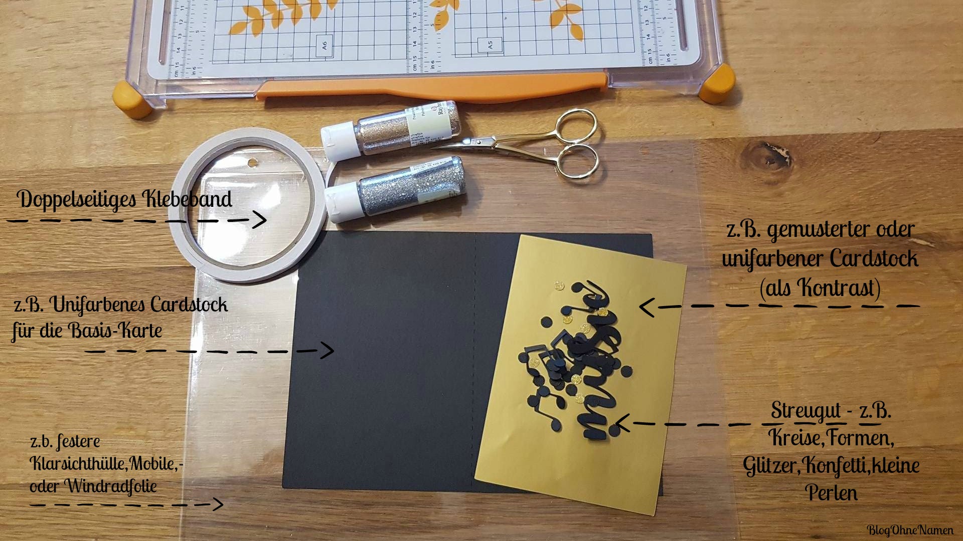 Wie oben erwähnt liegt der Fokus auf dem Erstellen einer einfachen Faltkarte – nicht auf dem dekorativen Aspekt. Eine Schüttelkarte erschien mir hier am sinnvollsten, weil man mit wenigen Mitteln etwas ganz tolles und besonderes Zaubern kann. Außerdem hat man so die Möglichkeit, die Karte immer an ein Thema anzupassen – ohne dafür hohe Ausgaben für Materialien zu haben.