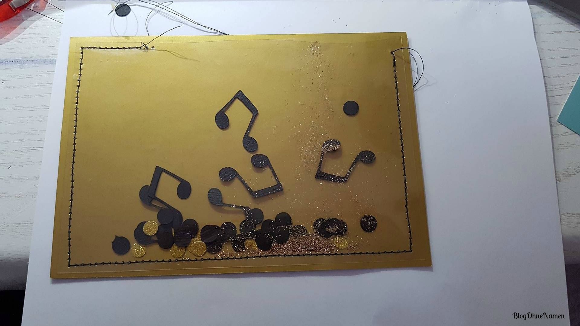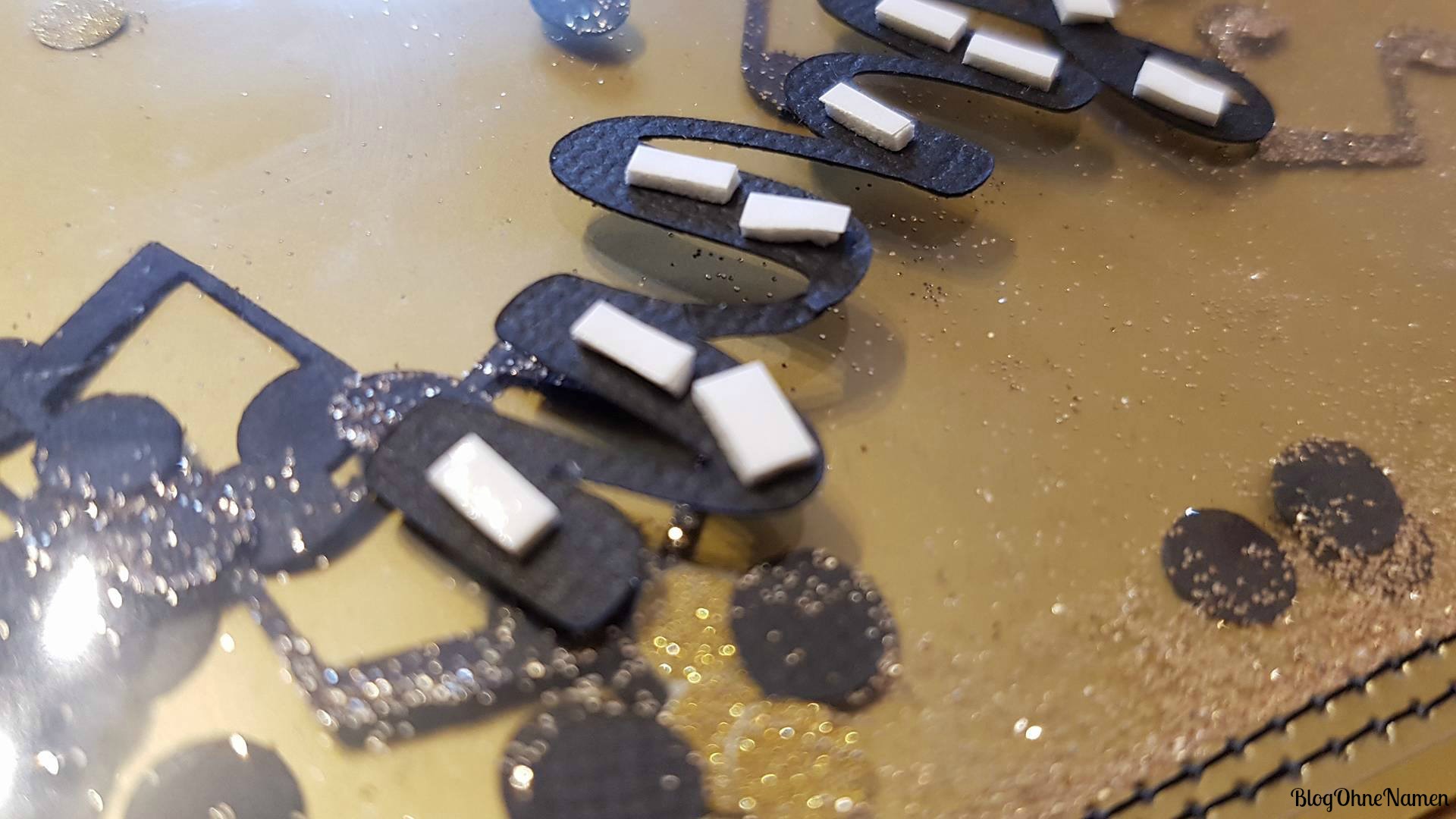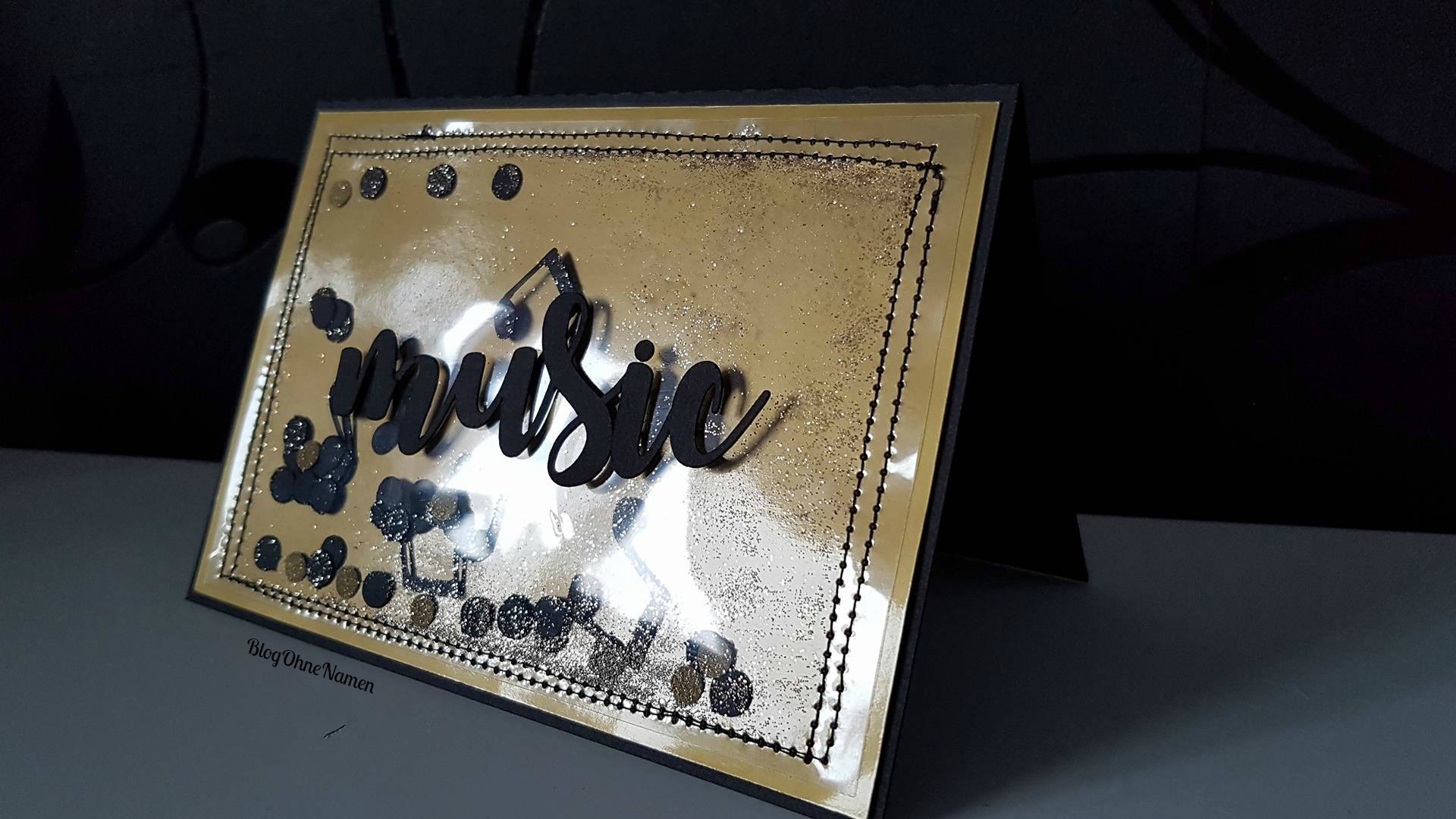 Zum Schluss hatte ich mir noch einen Schriftzug „music“ ausgeplottet. Dieses wurde mit halbierten 3D-Klebepads* auf die transparente Folie aufgebracht. So sieht die Karte nicht ganz so langweilig aus,oder? Wer möchte, der kann auch Vinylfolie aufbringen. Wie das aussieht, könnt Ihr Euch hier anschauen.