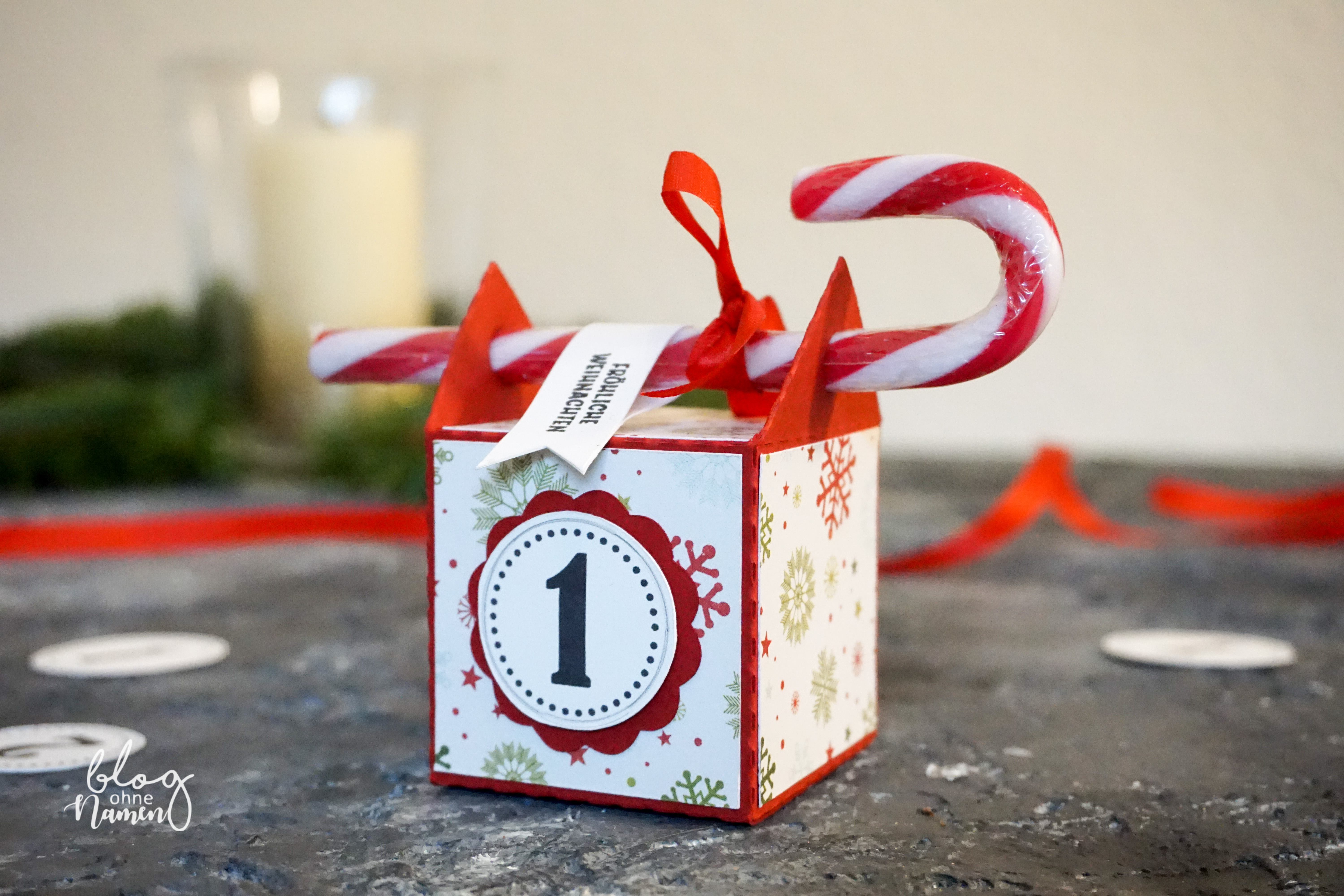 Mit ein wenig Designerpapier, etwas Satinband und einigen Dekoelementen – wie einem bestempelten Fähnchen – werden die Verpackungen zu einem richtigen Hingucker. Befestigt man letzteres geschickt an der Zuckerstange, so hat man zudem ein „Siegel“, welches beim entfernen der Stange zerstört wird. Gefüllt werden die kleinen Schächtelchen übrigens mit einer Weihnachtsgeschichte, die wie ein Kalender funktioniert. Für die „freien“ Tage haben wir uns kleine Aktionen wie z.B. geminsames Basteln, ein Weihnachtsfrühstück mit Musik und ein Weihnachtsspiel überlegt. So ist für Spannung, Spaß und gemeinsame Aktivitäten gesorgt.