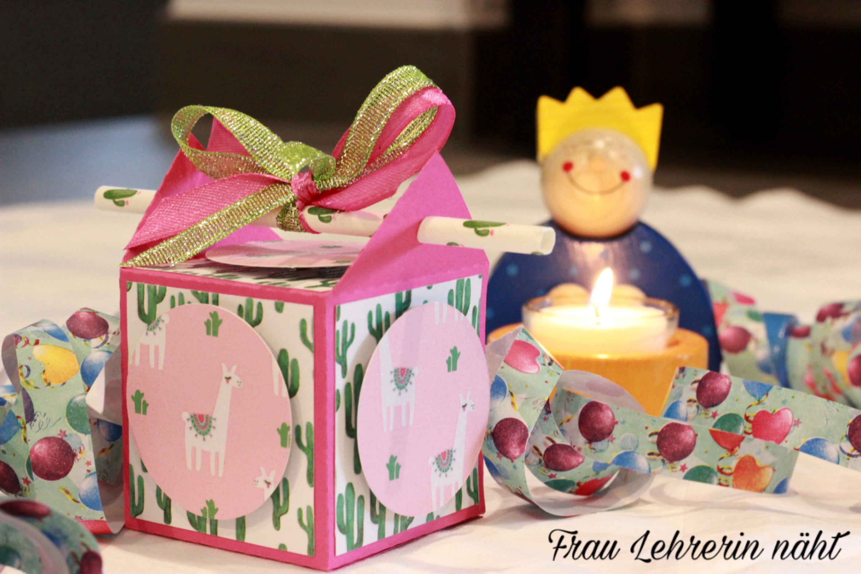 Ilka („FrauLehrerinnäht„) hat ebenfalls einige Designbeispiele für Euch angefertigt. Neben einer Verpackung, die als Geschenkbox für eine Lama-Wanderung dienen soll, hat auch sie eine für Halloween gebastelt. Die Idee mit den Kürbissen auf den Strohhalmen ist absolut genial.