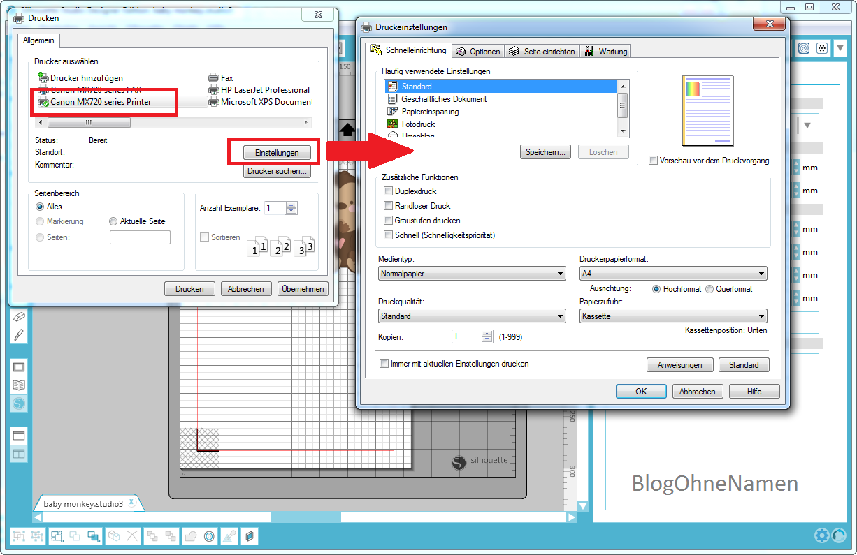 Habt Ihr die Bearbeitung abgeschlossen, dann könnt Ihr Eure Motive nun mit dem Drucker ausdrucken und anschließend mit dem Plotter ausschneiden. Zum Drucken wählt Ihr in der oberen Leiste „Datei-Drucken“ und könnt dann die passenden Einstellungen für Euer Material wählen.