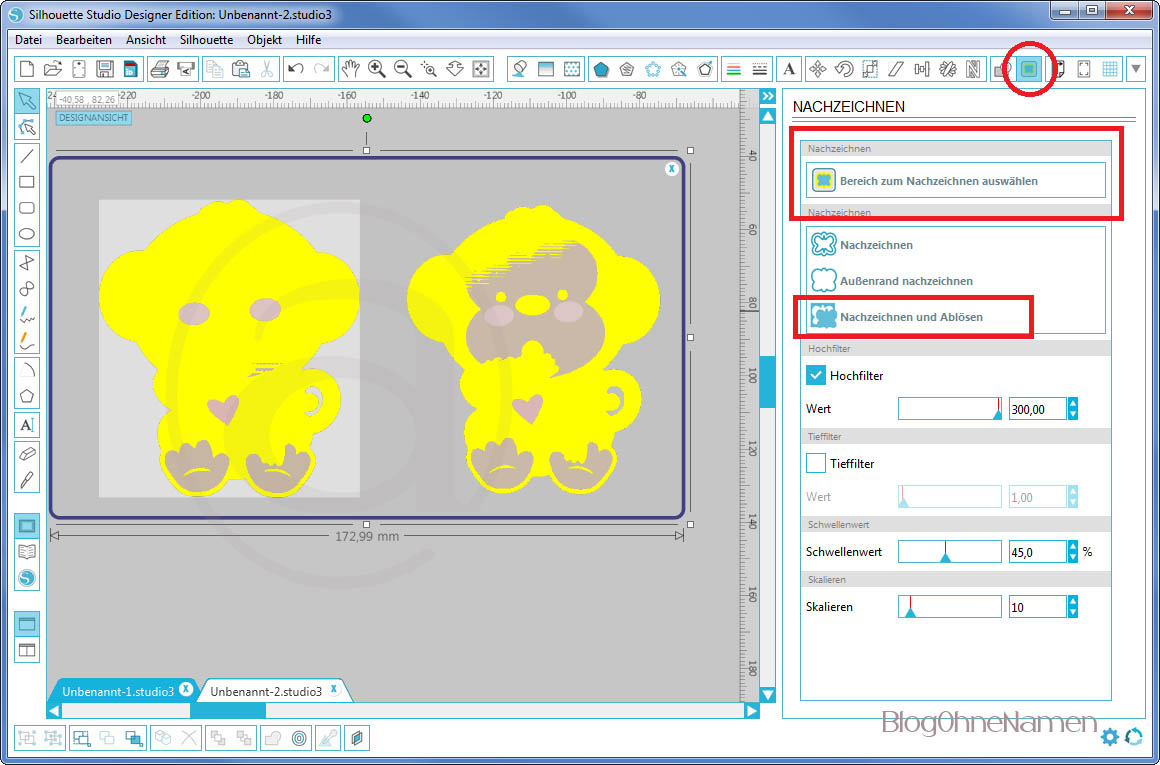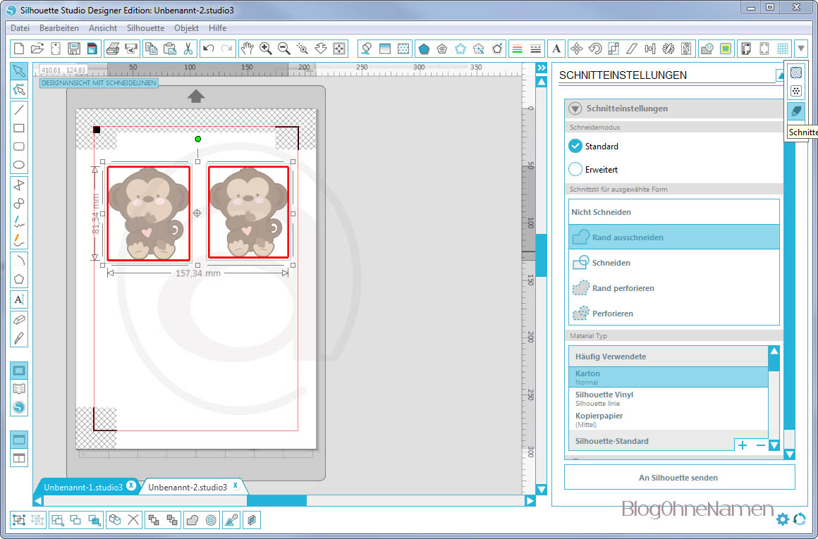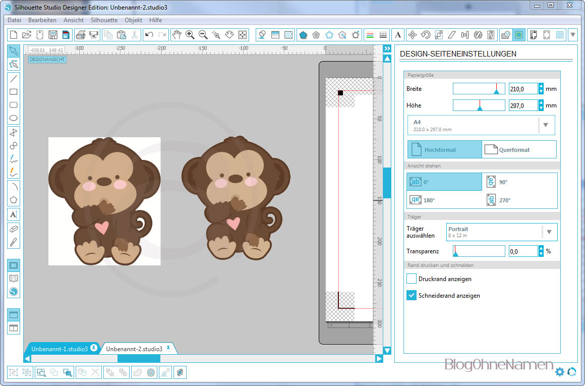 Würden wir das ganze jetzt so drucken und versuchen zu schneiden, dann würde uns nur ein Quadrat ausgeschnitten werden.Die Affen müssten wir dann (vermutlich) von Hand ausschneiden. Damit das nicht passiert, müssen wir für unser Motiv eine Schnittlinie anlegen und es ein wenig bearbeiten, damit wir am Ende ein schönes Ergebnis bekommen.
