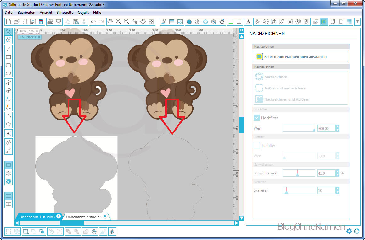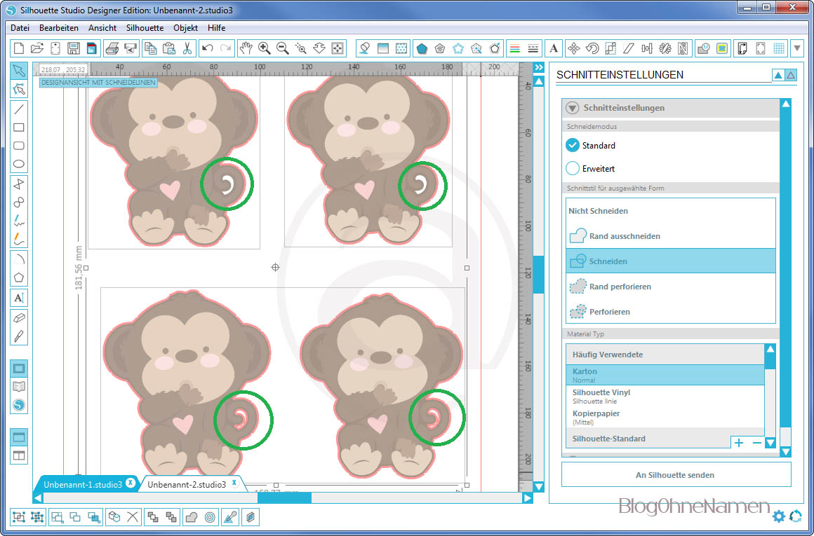 Hier könnt Ihr nun den Unterschied zwischen beiden Äffchen sehen. In der oberen Reihe wird nur die Außenlinie geschnitten und in der unteren Reihe wird jetzt noch zusätzlich im inneren des Schwänzchens geschnitten. 🙂