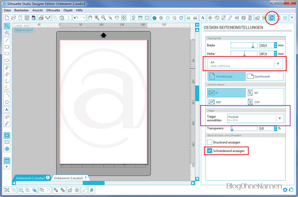 [Tipp]: Natürlich kann ein Cameo-Benutzer ebenfalls mit Print & Cut arbeiten – allerdings muss dafür nicht zwingend der Träger geändert werden. Für meinen Cameo bleibt das Format des Trägers auf A4 stehen, denn so habe ich einen besseren Bezug zu dem ganzen Format.