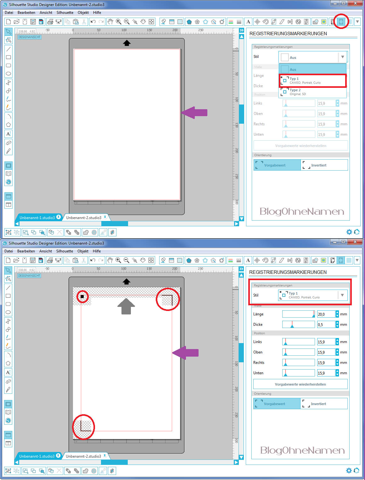 Klickt auf den Reiter „Registrierungsmarkierungen“ und wählt „Typ1 – Cameo,Portrait,Curio“ aus.