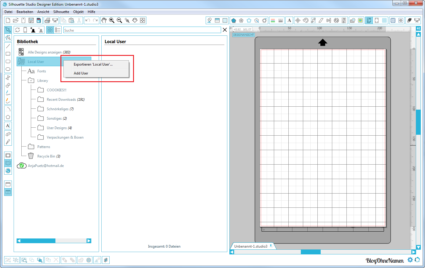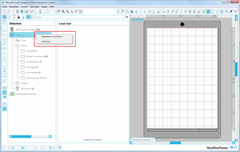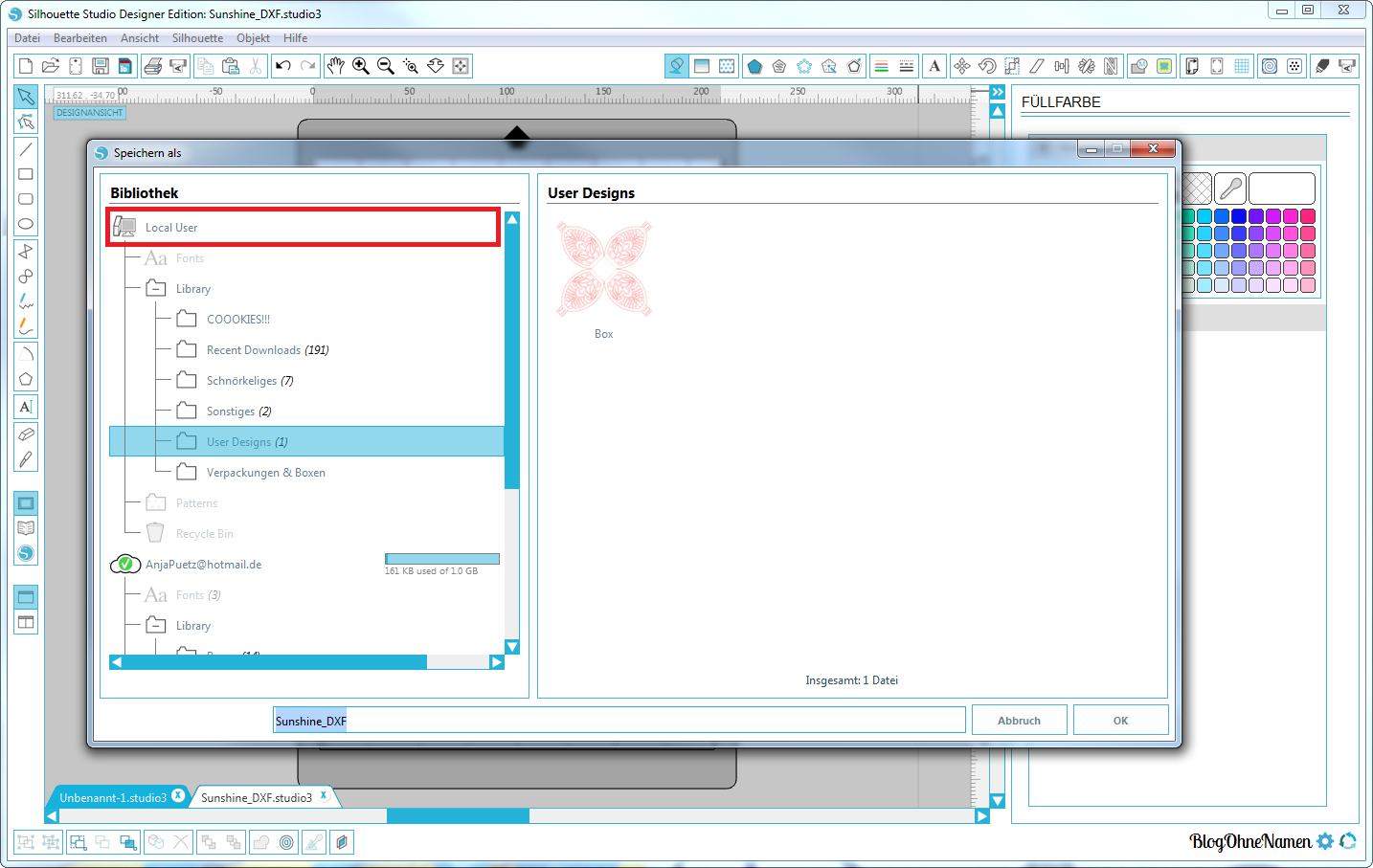 Die lokale Bibliothek (local User) ist das, was wir von „früher“ kennen. Hier konnten wir unsere Designs immer verwalten,verschieben und Ordner mit entsprechenden Unterordnern nach Herzenslust erstellen. Diese Bibliothek ist in unserer Software,auf unserem Pc und Offline für uns verfügbar.