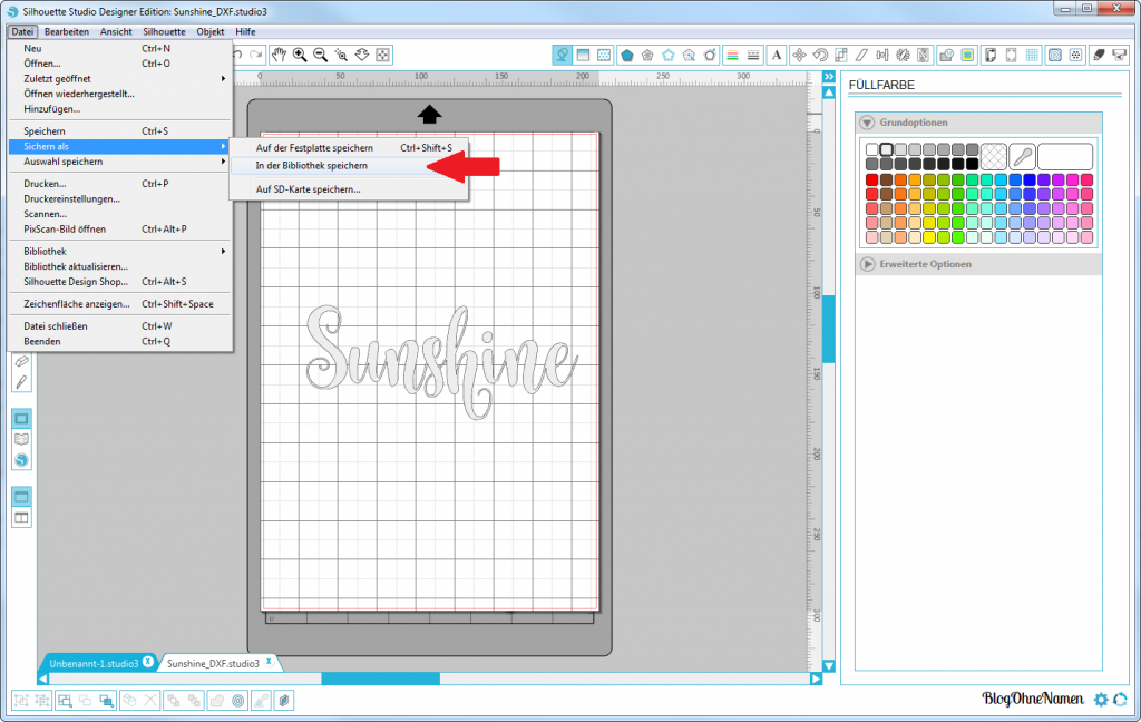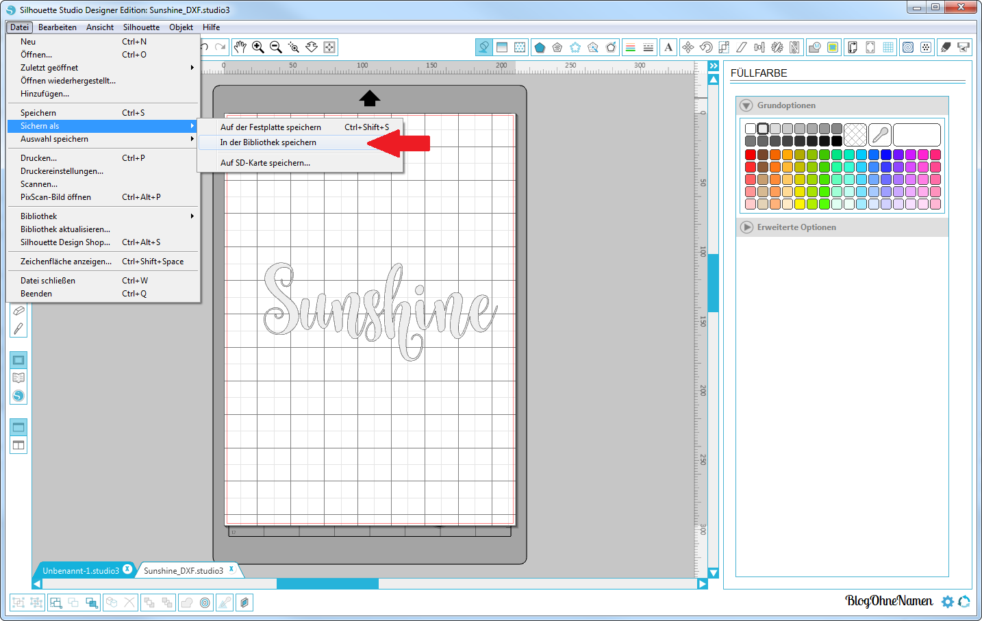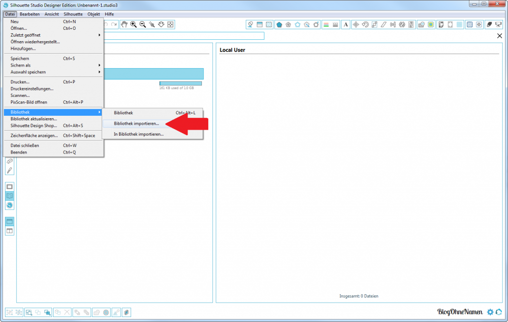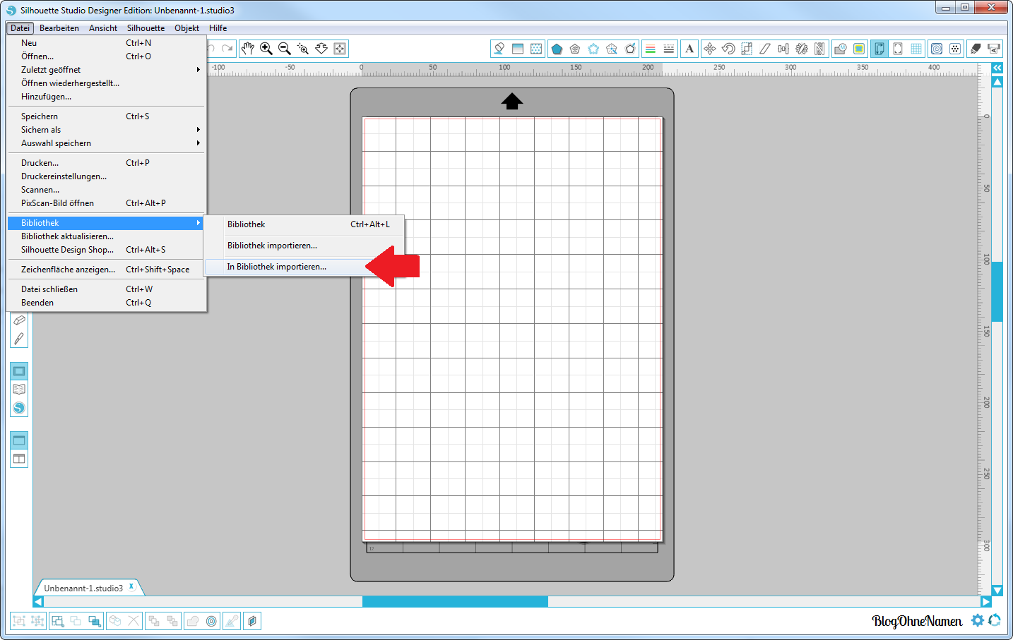 Öffnet auch hierfür wieder die Silhouette Software, geht auf „Datei“ und anschließend auf „Bibliothek“ und dann letztendlich auf „In Bibliothek importieren“.