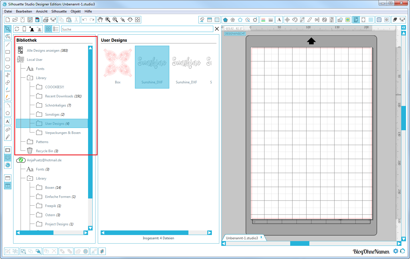 Über den Reiter „Datei“ -> „Bibliothek“ -> „Bibliothek importieren“ könnt Ihr dann die gespeicherte Datei aus dem vorherigen Schritt importieren. Zuvor müsst Ihr allerdings noch Eure Zugangsdaten (unter denen kauft Ihr auch im Silhouette Design Store ein und nutzt die Cloud damit) eingeben.