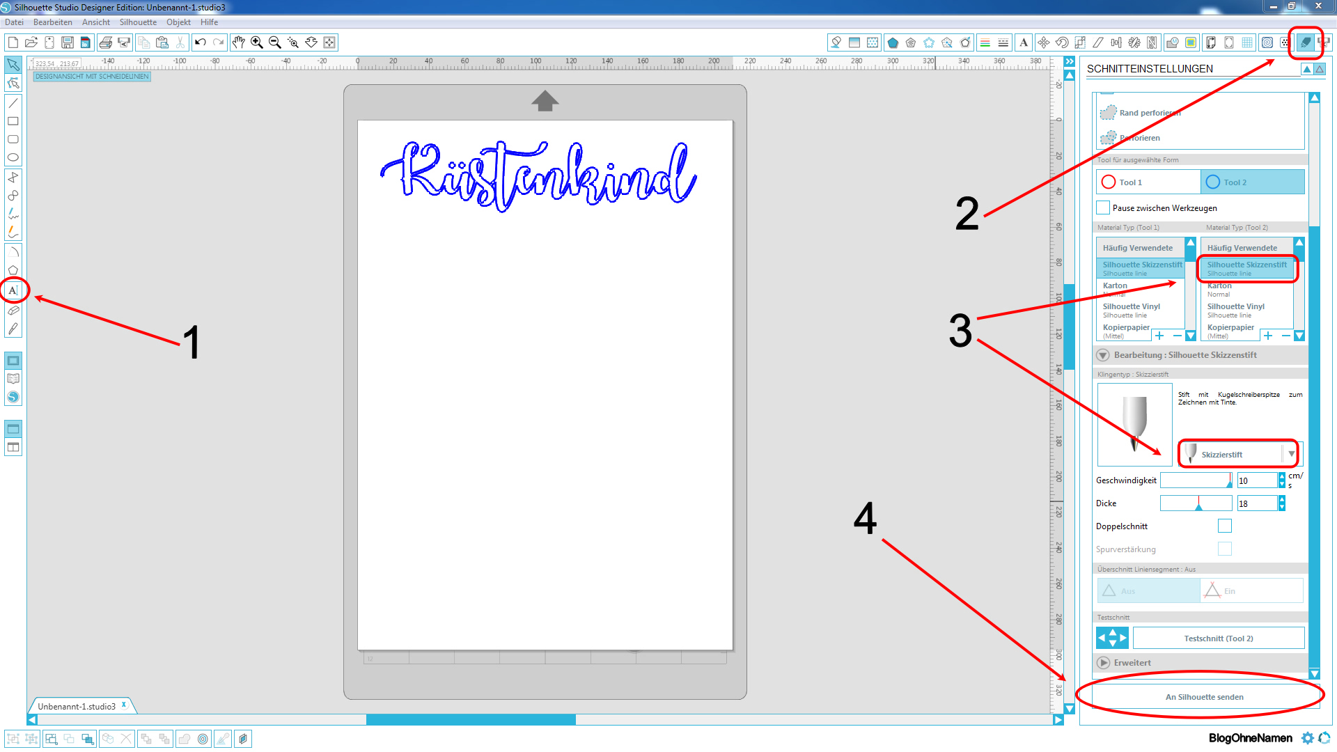 Wechselt anschließend in die Schnitteinstellungen (2) und stellt den Material-Typ auf „Silhouette Skizzenstift“ (3) und den Klingentyp auf „Skizzierstift“ (3) ein. Arbeitet Ihr mit dem Cameo 3, dann müsst Ihr es noch dem zweiten Werkzeughalter (Tool 2) zuweisen. Wichtig ist, dass immer diese Einstellungen benutzt werden. So ist gewährleistet, dass beim späteren „Zeichnen“ immer mit dem selben Druck und der gleichen Geschwindigkeit gearbeitet wird!