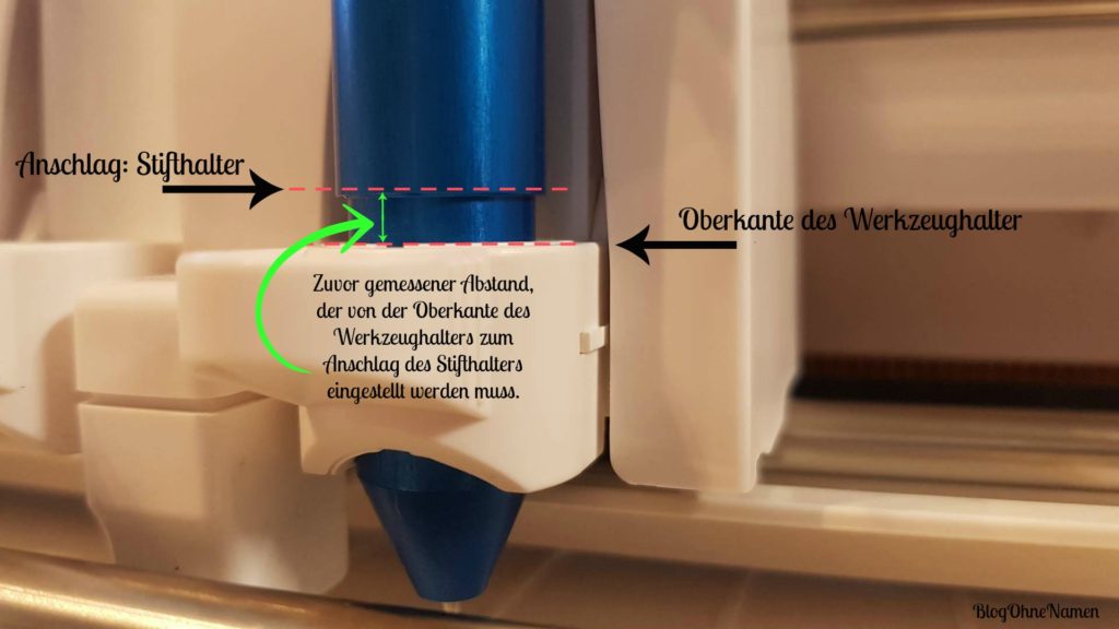 Habt Ihr einmal euer Messer falsch eingestellt und Euch vielleicht ein Papier,eine Folie oder sogar die Schneidematte total zerschnitten? Ähnlich ist es mit dem Stifhalter – der kann allerdings keinen „richtigen“ Schaden dabei anrichten. Schaut die Spitze des Stiftes zuweit aus dem Halter heraus (wenn dieser vollständig im Werkzeughalter eingesetzt ist), dann setzt der Stift kontinuierlich auf dem Papier auf und zeichnet durchgehend Linien. Da jeder Stift eine andere Spitze (es gibt lange und kurze Spitzen) hat, ist es notwendig diese Einstellung vorzunehmen.